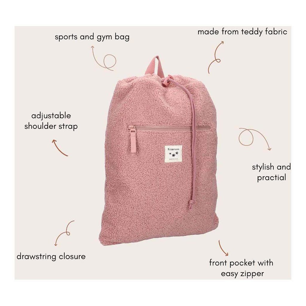 Betreed de wereld van stijl met onze Kidzroom gymtas uit de "Teddy in Town" collectie! Deze gymtas is gemaakt van zachte teddy stof en heeft een zachte lichtroze kleur. Het subtiele logo van Kidzroom op de voorkant voegt een vleugje verfijning toe aan het ontwerp. De tas is ontworpen met het oog op gemak en stijl, met sluit touwtjes die het afsluiten moeiteloos maken. Met de pluizige teddy stof, lichtroze kleur en praktische ontwerp is deze gymtas de perfecte metgezel voor elke gelegenheid. Voeg een vleugje stijl toe aan het dagelijkse routine met de gymtas van Kidzroom uit de "Teddy in Town" collectie!