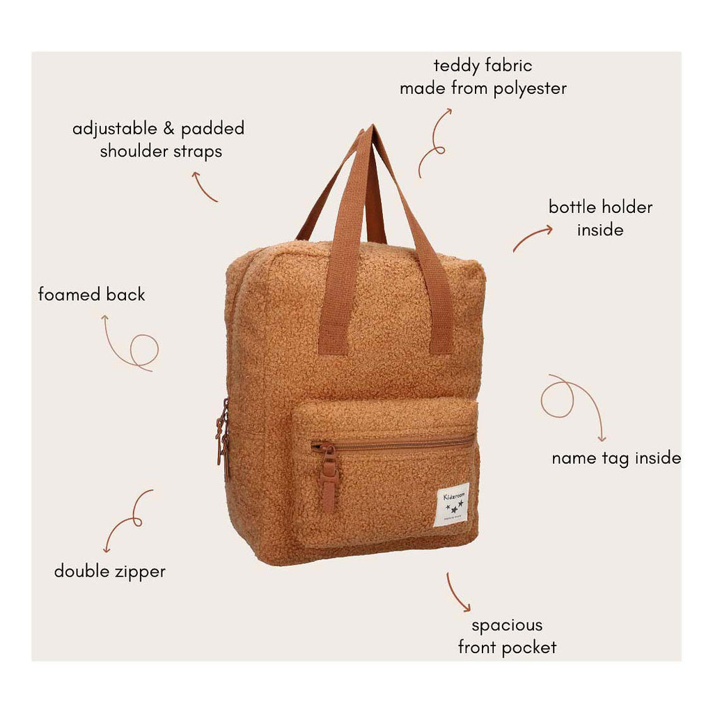Deze leuke rugzak van Kidzroom uit de Soft Whispers collectie is volledig van teddystof! De tas is bruin van kleur en heeft een ruim hoofdvak die sluit met een rits. Verder heeft de tas nog een voorvakje. Aan de bovenkant van de rugzak zijn 2 handige handvaten waardoor de tas gemakkelijk aan de hand te dragen is. Verder zijn de schouderbanden te verstellen en voor iedereen op maat te maken.