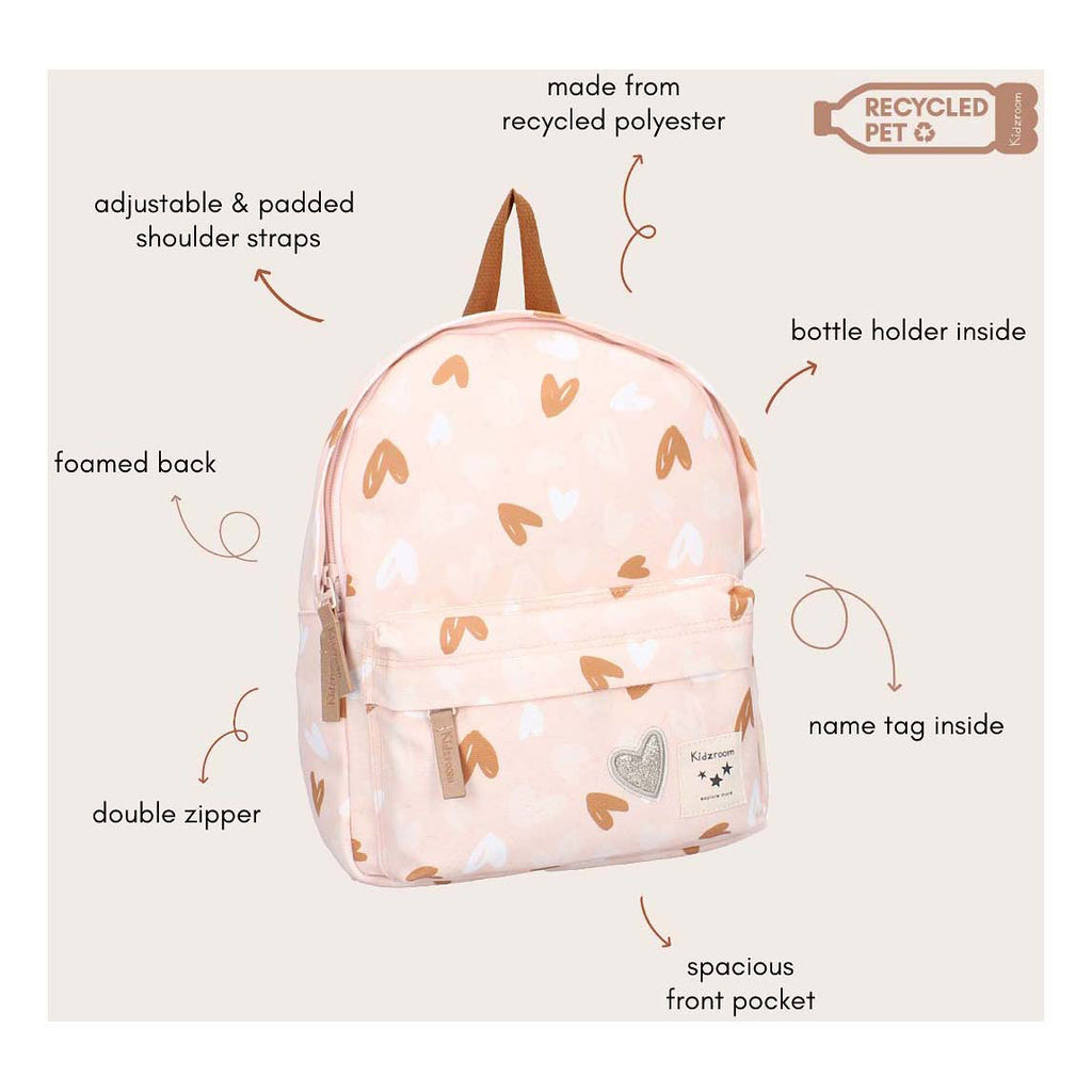 Als dit geen schattige rugzakjes zijn? Die wil je kindje vast overal mee naartoe nemen. Deze rugtas uit de collectie Loving Days is bedrukt met leuke all-over printjes. De rugzak heeft een handig voorvak met een rits met ruimte voor de kleinere spulletjes die mee moeten. Het grote hoofdvak heeft een handige dubbele rits en biedt ruimte voor bijvoorbeeld een broodtrommel of extra setje kleding. Handig als je kindje de rugtas mee naar school neemt. De rugzak is te dragen aan de lus aan de bovenkant of op de rug met de verstelbare schouderbanden. De rugzak heeft aan de binnenkant een rits voor kleine spulletjes en een label voor naam en telefoonnummer, zodat iedereen weet van wie deze trendy tas is. Dit rugzakje is voorzien van lining voor een betere kwaliteit en een langere levensduur. De rugzakken uit de Loving Days collectie worden in Europa gemaakt. Dit zorgt voor hoogwaardige producten met de beste kwaliteit.