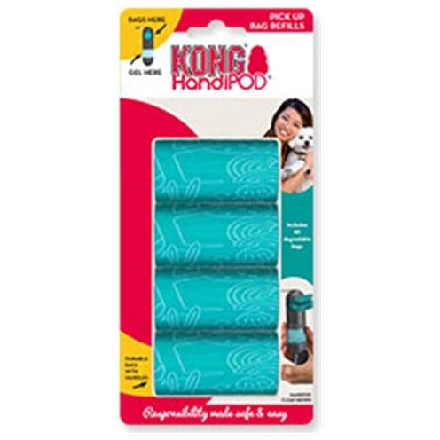 De is een navulling voor de KONG Handipod met biologisch afbreekbare poepzakjes met handvaten. Deze verpakking bevat 4 rollen met elk 15 poepzakjes.