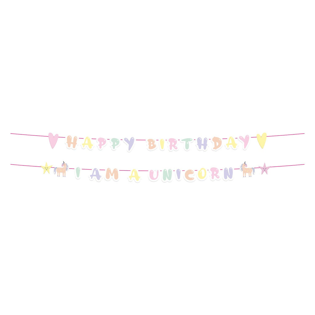 Deze leuke letterslinger is helemaal in eenhoornthema, met eenhoorns, hartjes en zachte kleuren. De voornamelijk slinger leest 'Happy Birthday' en de onderste letterslinger 'I am a Unicorn'.