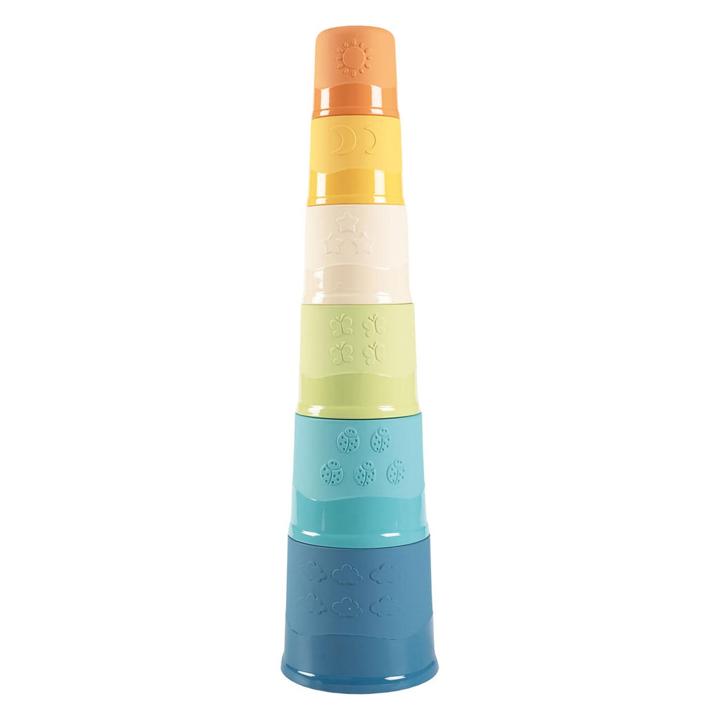 De bekende stapeltoren voor baby's in een groen jasje. De 6 kleurrijke stapelbekers zijn voor 90% gemaakt van bioplastic (gemaakt van suikerriet) en zijn 100% recyclebaar. De bekers hebben verschillende patroontjes om te voelen en te bekijken. Geschikt voor kinderen vanaf 12 maanden.