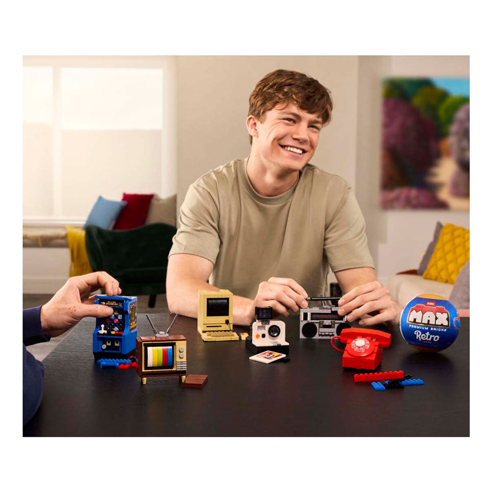 . Displayverpakking met verrassingsballen. Elke bal bevat de bouwstenen om één retro-apparaat te bouwen, zoals een telefoon met draaischijf, TV met antenne, of ouderwetse radio. Verzamel ze alle 6. Geschikt voor kinderen vanaf 3 jaar.