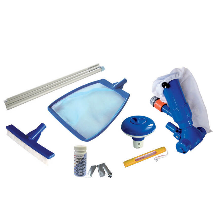 De Kokido 6-delige reinigingsset is een ideaal pakketaccessoires om het zwembad compleet mee te reinigen. De set bevat: een stofzuiger om de bodem van het zwembad schoon te maken, een schepnet om het drijvende vuil te verwijderen, een borstel om de zwembadwanden mee te schrobben, een chloordrijver voor het oplossen van chloortabletten in het water, teststrips om het chloorgehalte en de pH-waarde van het water te meten en een thermometer voor de zwembadtemperatuur. Geleverd inclusief een 4-delige telescoopsteel om de stofzuiger, borstel en schepnet op te ingewikkeld. Kortom, een ideale starterskit met al het benodigde gereedschap om een zwembad te onderhouden.