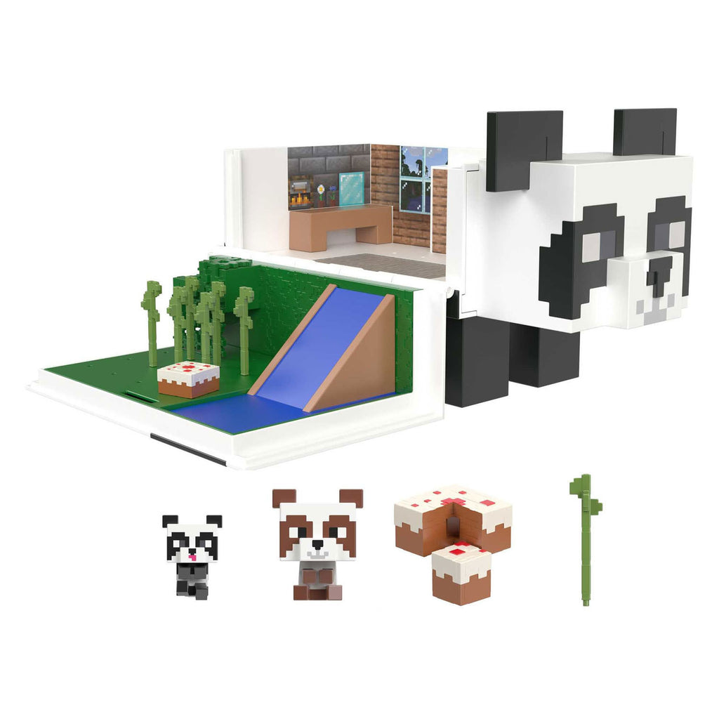 Als je deze reusachtige Minecraft Panda speelset opent, zie je een bungalow met twee verdiepingen voor de panda en de pandababy Mob Hoofd Minifiguren, beide inbegrepen. Laat ze langs de 'waterglijbaan' van de verdieping naar de tuin glijden. Pluk een stengel bamboe en de verjaardag kunnen beginnen. Vergeet niet een stukje van die verrukkelijke taart te nemen! De avonturen van de panda's gezocht voor fans van Minecraft urenlang speelplezier. In de set kun je ook extra Mob Hoofd Minifiguren opbergen (apart verkrijgbaar en niet overal leverbaar). Kleuren en versieringen kunnen verschillen.