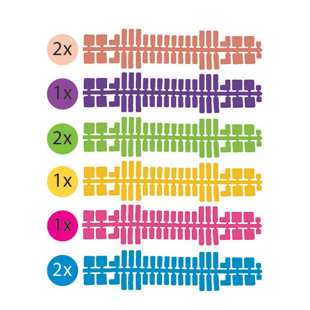 Voeg kleurenstrips toe aan je Ministeck steentjes verzameling met deze set. De kleuren perzik, groen, blauw, oranje, roze en paars zijn inbegrepen. Verpakt per 9 stuks.