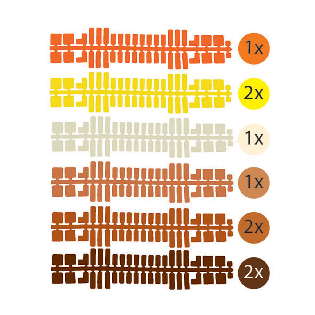 Breid je Ministeck steentjes verzameling uit met deze kleurenstrips in de karamelkleuren (2x), geel (2x), donkerbruin (2x), oranje (1x), lichtbruin (1x) en beigegeel (1x). Verpakt per 9 stuks.