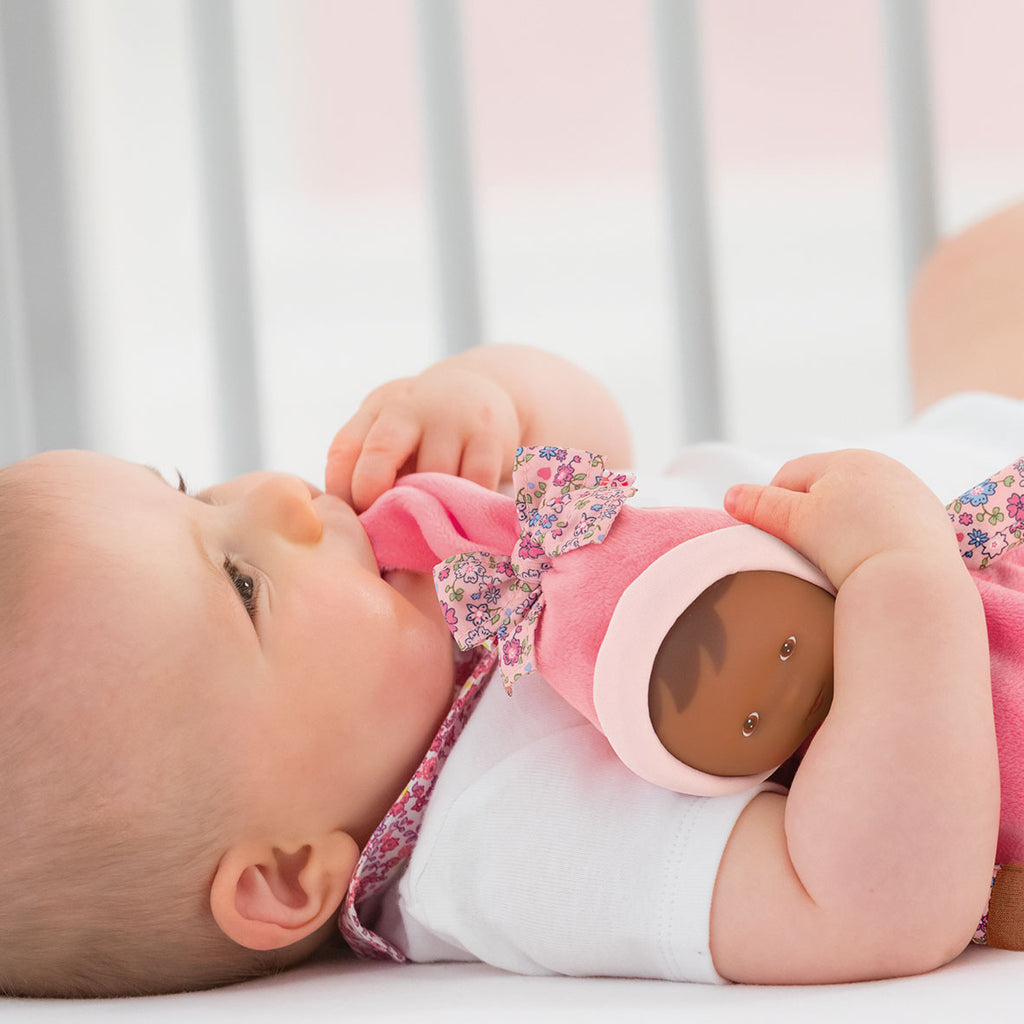 Een schattig popje voor de allerkleinsten. Het gezichtje van het Doudou Miss Floral popje is herkenbaar voor je baby, wat een geruststellende invloed heeft. De stoffen pop is gemakkelijk vast te pakken voor kleine handjes aan het mutsje of de armen of benen. De innerlijke vanillegeur van de pop werkt tevens geruststellend en troostend. Heerlijk voor in bed. De Doudou is 25 centimeter groot en gemaakt van zacht katoen. Het popje is te wassen op een programma voor delicate was.