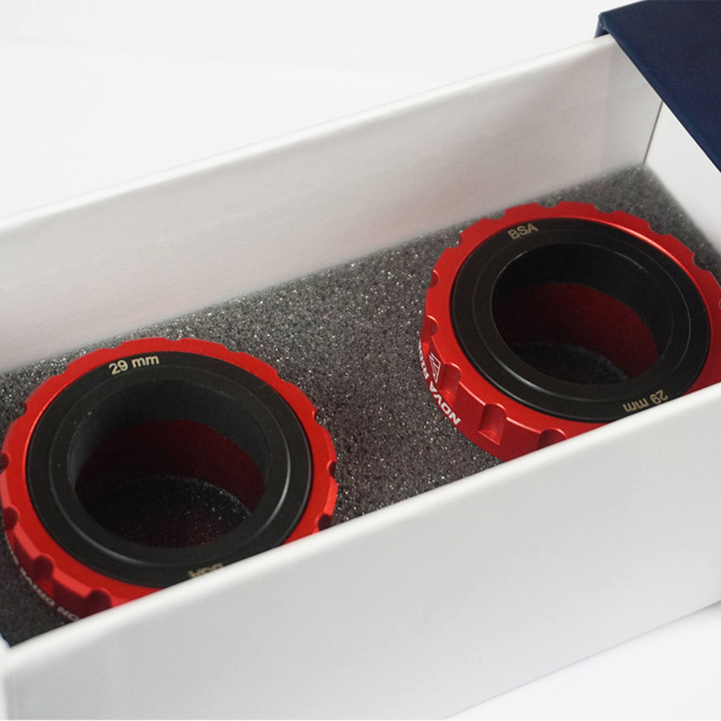 De Nova Ride trapas verbetert de soepelheid van je transmissie, wat een krachttoename toelaat, om de meest veeleisende tevreden te stellen. Dankzij deze trapas kunt u rustig en soepel trappen. Gemaakt van zeer hoogwaardige materialen: twee 7075 aluminium cups CNC bewerkt en geanodiseerd voor een betere stijfheid en gekoppeld aan keramische kogellagers die de wrijving op de crank verminderen en de transmissie van je aandrijving verbeteren. Het afdichtingsstuk beschermt de lagers tegen weersinvloeden en verhoogt de duurzaamheid van het product. BSA 29 & 30mm (101g) : Om de bottom bracket te monteren heb je een speciaale tool nodig om uw trapas tijdens de installatie vast te zetten. Klik hier om deze te bestellen. Compatibiliteit A - Frame breedte : 68/73mm B - Interne schaal diameter : 34,8mm C - Diameter crankstel : 24/29/30mm BSA - Engels schroefdraad 24mm: Shimano cranksets. 29mm: Sram DUB cranksets. 30mm: Praxis / FSA / Rotor / Cane Creek crankstellen.