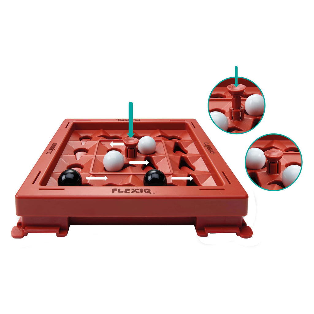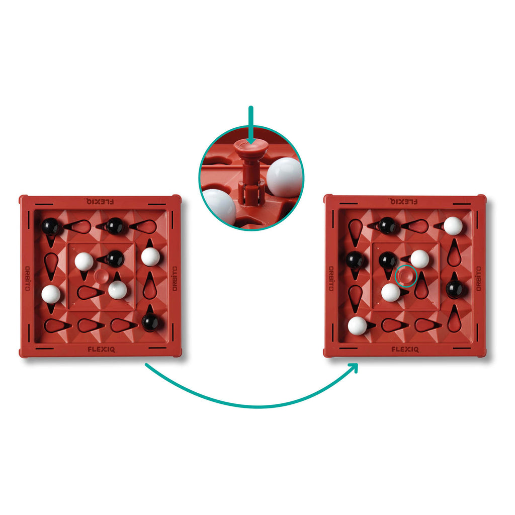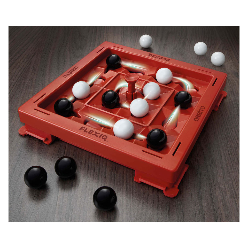 Orbito is een snel strategiespel voor 2 spelers met heel eenvoudige regels. Makkelijk te leren, moeilijk te winnen! Leg om de beurt een van je knikkers op het spelbord en probeer 4 knikkers van jouw kleur in een horizontale, verticale of diagonale lijn te krijgen op het bewegende speelbord. Maar let op, om je beurt te stoppen, moet je de Orbitoknop indrukken. Hierdoor verschuiven ALLE knikkers 1 positie in hun 'orbit'! Dwarsboom ook de strategie van je tegenstander door tijdens jouw beurt een van zijn knikkers te verplaatsen naar een reguliere, vrije positie. Maak een horizontale, verticale of diagonale lijn van 4 knikkers in jouw kleur en win! Inhoud: 1 bewegend 4x4 spelbord met Orbitoknop 8 witte knikkers 8 zwarte knikkers spelregels