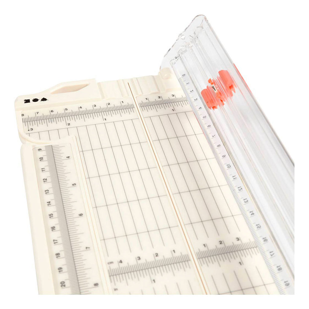 Draagbare snijmachine met kunststof oppervlak, gedrukte rasterlijnen en inklapbare liiaal. Kan tot 5 vel van 80 gr. snijden. Reservemessen - Artikelnr. 12505