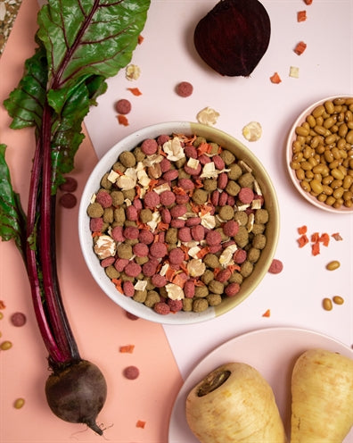 Samenstelling: rodebiet 24% (gedroogd); maïs; maïsgluten; erwten; aardappeleiwit; bonen 8% (gedroogd); zonnebloemolie; erwteneiwit; wortel 5% (gedroogd); aardappelzetmeel; pastinaak 3% (gedroogd); mineralen; bietenpulp; lijnzaad; gehydrogeneerd raapzaad; taurine