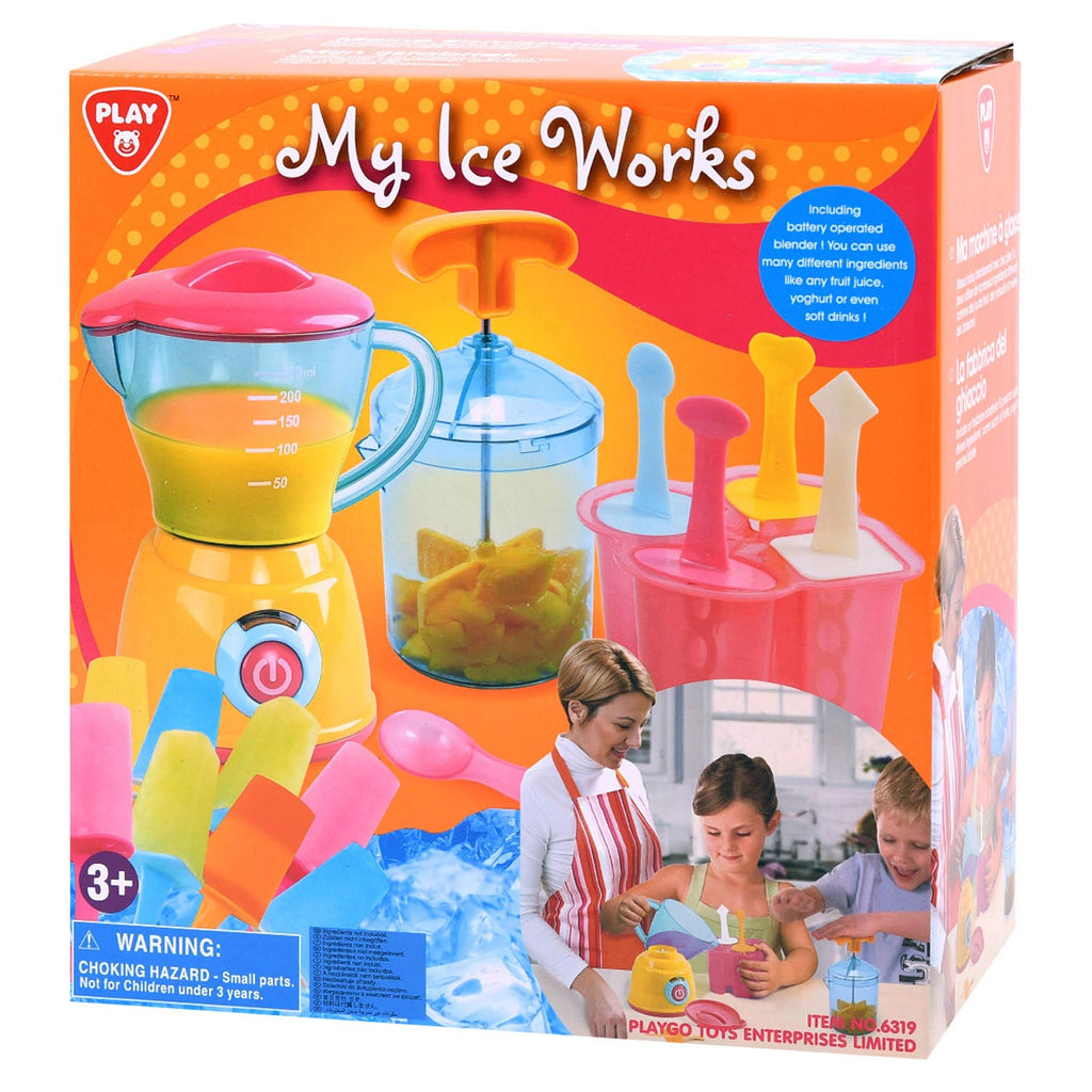 Gek op ijs? Met deze ijsset van Play maak je super eenvoudig je eigen ijslolly's. Er zijn geen grenzen aan je fantasie! Wat is jouw favoriete smaak? Het pakket bevat een blender, een fruitnijder en vier aangedreven plastic ijslolly's. De blender werkt op 2 AA-batterijen (niet inbegrepen).
