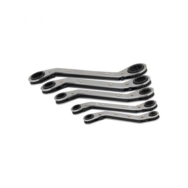 Set van 5 ringratelsleutels in verschillende maten: 6 x 8 mm, 10 x 12 mm, 11 x 13 mm, 14 x 17 mm en 19 x 21 mm. Deze ring-ratelsleutels hebben een omschakelbaar ratelmechanisme voor gemakkelijk gebruik. Ze zijn van degelijke kwaliteit en worden geleverd in een blisterverpakking.