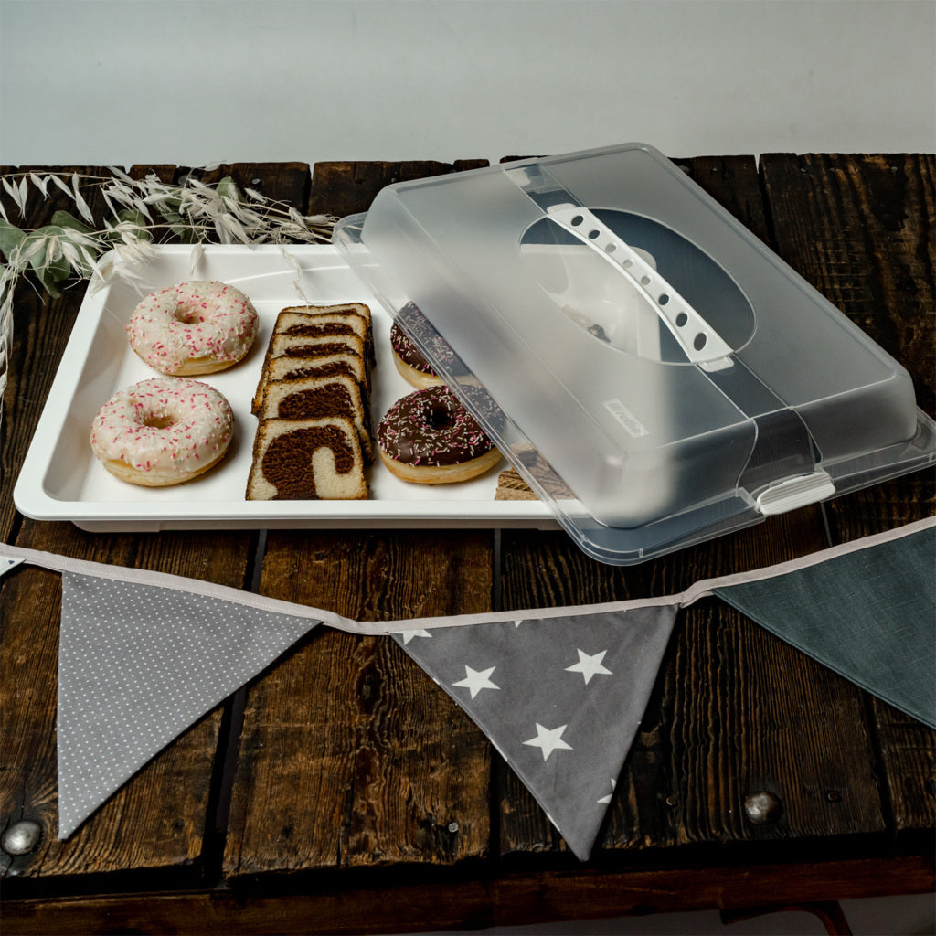 De partybutler JOHN is verkrijgbaar in verschillende praktische maten. Het is gemaakt van onderhoudsvriendelijk, vaatwasserbestendig plastic, dat zeker voedselveilig en BPA-vrij is. Het transparante deksel van de transportbox wordt met twee zijclips stevig aan de basis bevestigd, de geïntegreerde draaggreep ligt comfortabel in de hand en zorgt voor een comfortabel transport. Om uw voedsel vers te houden, zorgt voor de gegolfde bodem voor luchtcirculatie. Wanneer u de bakjes niet gebruikt, kunt u meerdere bakjes in elkaar stapelen om ruimte te besparen. Handig voor iedereen die graag bakt en de mensen om zich heen verwent met heerlijke hapjes en taarten.