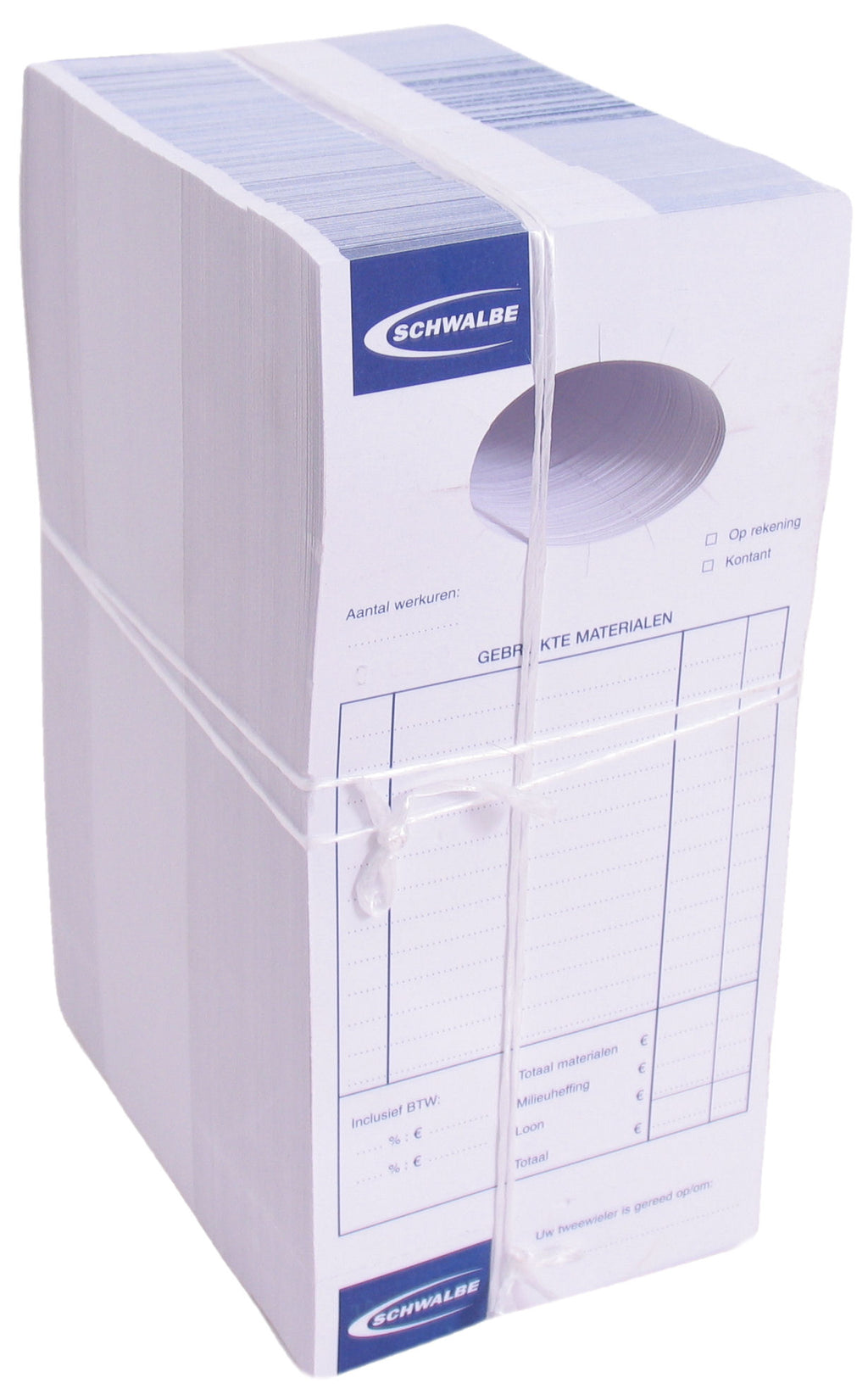 Reparatiekaarten van Schwalbe zijn de oplossing voor het probleem van het vermelden van welke fiets van wie is en welke reparaties er moeten gebeuren. Op de voorkant van de kaart kun je de naam, het telefoonnummer en het adres van de klant opgeven. Daaronder is er ruimte om aan te geven welke reparaties er aan de fiets moeten worden uitgevoerd. Ook kun je invullen wanneer de fiets wordt gebracht en wanneer hij weer klaar moet zijn. De klant krijgt het onderste strookje van de kaart mee waar een nummer op staat, zodat de juiste fiets kan worden meegegeven. Dit strookje dient tevens als bewijs dat de klant de fiets heeft gebruikt.