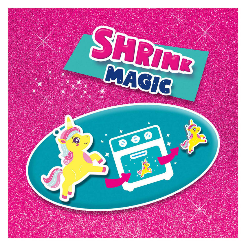 Maak je eigen magische armbanden met de Unicorn - Bedelarmbanden set! Met krimpfolie maak je je eigen eenhoornbedels. Trek de figuren eenvoudig met kleurpotlood over van de instructies en kleur ze in zoals je zelf wilt. In de oven krimpen de bedden snel en worden zo kleiner, intensiever van kleur en sterker. Rijg ze samen met de sterren en parelmoer kleuren kralen aan de elastische draad en creatie zo 5 prachtige, unieke armbanden.Lekker knutselen voor iedereen die van tekenen en unicorns houdt!