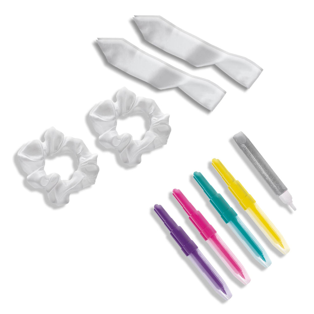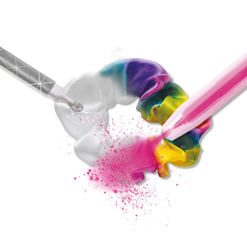 Hoe leuk is het als jij zelf je eigen scrunchies kan versieren? Een must-have voor iedere fashionista! De set bestaat uit twee scrunchies en twee linten. Met de vier uur blow airbrush stiften en de glitterlijm maak jij de coolste figuren, patronen en effecten!