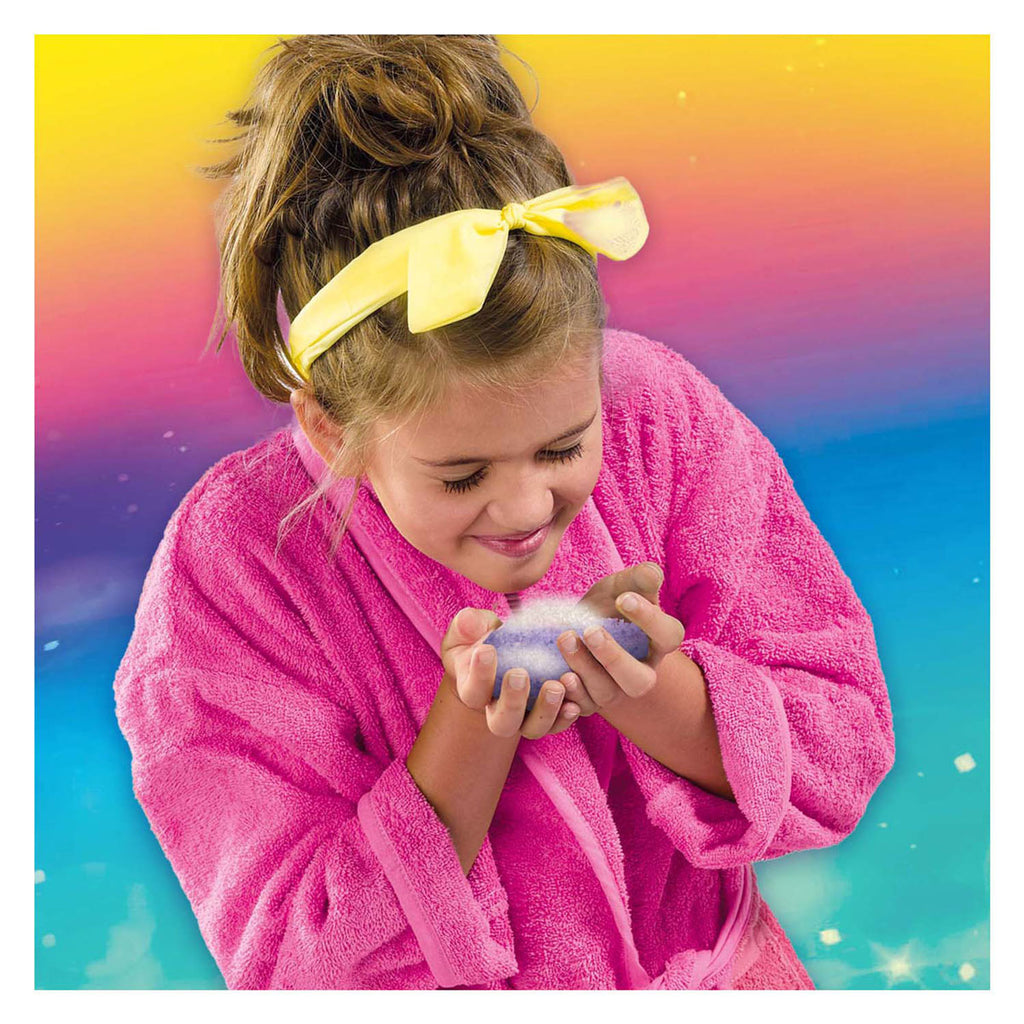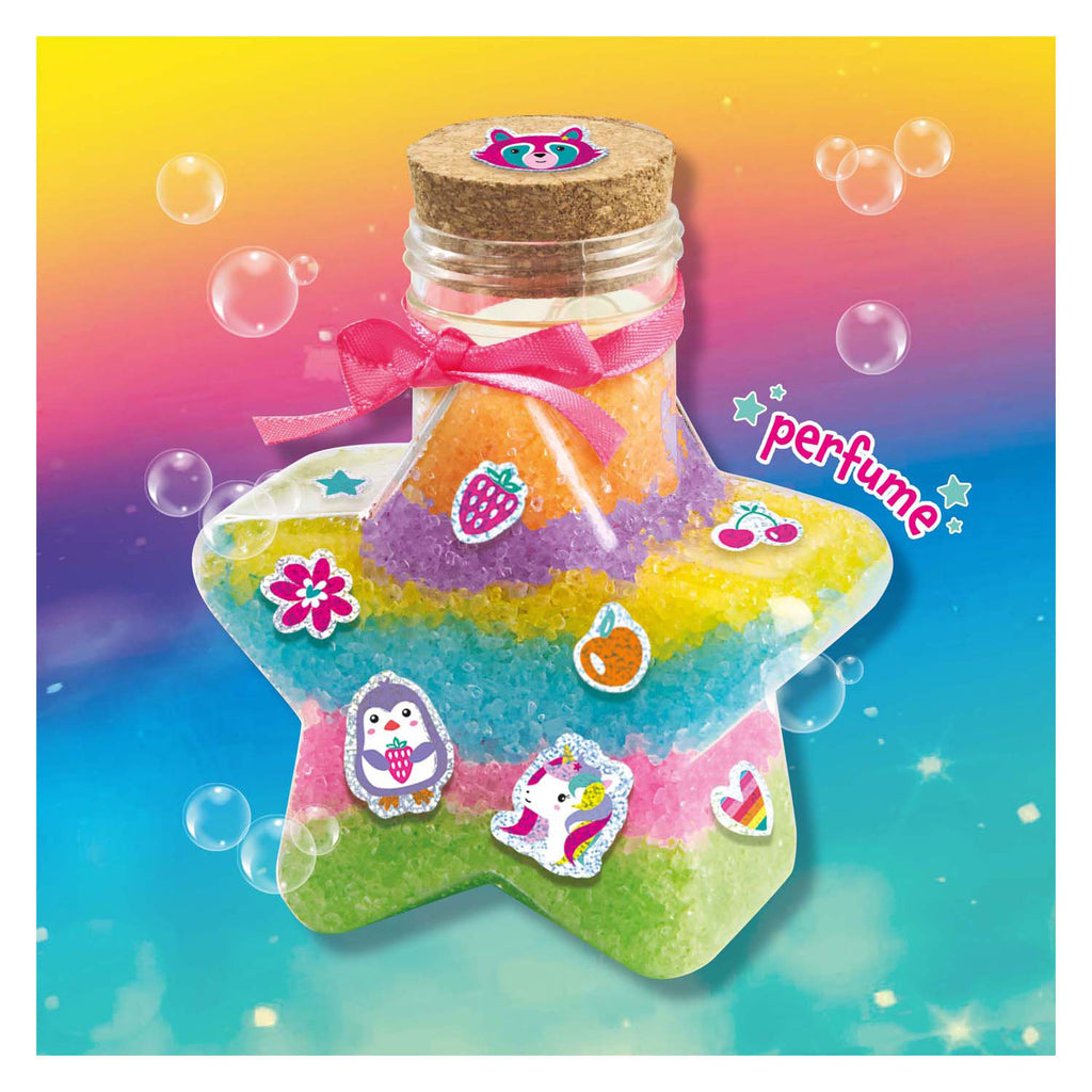 Creëer je eigen magische Galaxy badzout! Met deze labset kun je zelf badzout kleuren en parfumeren. Maak verschillende kleuren badzout door steeds wat badzoutkorrels te mengen met parfum. Door de rode, gele en blauwe parfum te mengen ontstaan verschillende zoete geur en mengkleuren. Gebruik de maatbeker, pipetjes en het roerstokje voor nauwkeurig doseren en mengen. Giet elke gemaakte kleur in de stervormige bewaarfles en geïnspireerd zo prachtig geïnspireerd lagen. Sluit de fles af met de kurken dop en versier jouw magische badzout met glitterstickers en lint.Dit prachtige, zelfgemaakte badzout is goed afwasbaar, cosmetisch en veilig te gebruiken. Perfect voor kinderen die van experimenteren houden!