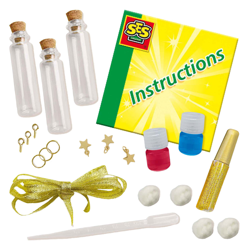 Creëer Magische Galaxy Stardust Sieraden Met de Galaxy Stardust Sieraden set kun je je eigen betoverende kettinghangers maken met een magisch effect. De rode en blauwe kleurstof vloeien prachtig samen met de glitters in de watten, wat zorgt voor een mysterieuze en prachtige sfeer. Versier de flesjes met het goudkleurige lint, een stervormig bedel, en een echte kurken dop. Deze zelfgemaakte sieraden worden gegarandeerd de favorieten van elk soort! Inhoud van de verpakking: 3 Mini flesjes met dop van kurk 3 Ster bedels 3 Bevestigingshaakjes 3 Bevestigingsoogjes Rode kleurstof (5ml) Blauwe kleurstof (5ml) Glitterlijm Goud Wattenbollen Goudkleurige lint Pipet Instructies Unieke Eigenschappen: Magisch effect in 3 flesjes met veilige kurken dop Maak unieke kleureffecten door rode en blauwe kleurstof te mengen Inclusief prachtige sterrenbedels en glitterlijm Gebruik de pipet om de kleuren aan te brengen Leuk om te maken en om te draag!Maak je Eigen Galaxy Sieraden! Deze set is perfect voor kinderen vanaf 5 jaar die houden van knutselen en sieraden maken. Laat je creativiteit de vrije loop en creatie iets magisch!Start Vandaag met je Sieradenavontuur! Pak de Galaxy Stardust Sieradenset van SES Creative en maak je eigen prachtige kettinghangers. Perfect om te dragen of cadeau te geven!