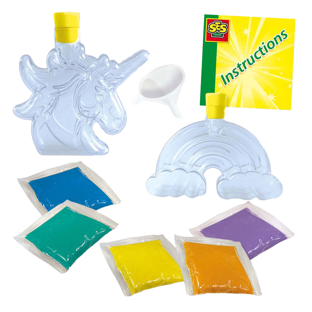 Galaxy Sand Art-flessen �?? Unicorn en Rainbow: Creëer Magische Zandkunst!Met deze Galaxy Sand Art Bottles set van SES Creative kunnen kinderen hun eigen unieke zandkunstwerken maken. Vul de eenhoorn- en regenboogflessen met lagen kleurrijke zand en prachtige decoratieve figuren. De lagen zand kunnen eenvoudig in de flessen worden gevuld met de bijgeleverde rechter. De flessen sluiten goed af met de mooie gele doppen, waardoor je kunstwerk veilig bewaard blijft. Inhoud van de verpakking:2 flessen (eenhoorn en regenboog)Kleurrijk zand in verschillende kleuren Trechter Unieke Eigenschappen:Thema: Eenhoorn en Regenboog Kleurrijk zand voor een prachtig effect flexibel te doseren zand met de trechter Stimuleert creativiteit Perfect om tentoon te stellen in de kinderkamer Creëer Sprankelende Zandkunstwerken Met deze set kunnen kinderen hun creativiteit de vrije loop laten en prachtige zandkunstwerken maken. De eenvoudige kleuren en de thematische flessen maken het eenvoudig om unieke en mooie creaties te maken. Het proces van zand gieten en lagen maken helpt bij de ontwikkeling van fijne motoriek en stimuleert het beeldingsvermogen. Waarom Dit Perfect Voor Jou Is Deze set is ideaal voor kinderen die houden van knutselen en decoreren. Het bevat niet alleen de creativiteit, maar zorgt ook voor een prachtig resultaat dat perfect is om te stellen in de kinderkamer. De set is veilig en gemakkelijk te gebruiken, wat het een ideale keuze voor ouders maakt. Begin Vandaag Nog Met Zandkunst Ontdek het plezier van zandkunst maken en betoveren de mooiste kunstwerken met SES Creative's Galaxy Sand Art Bottles. Perfect voor urenlang creatief plezier!