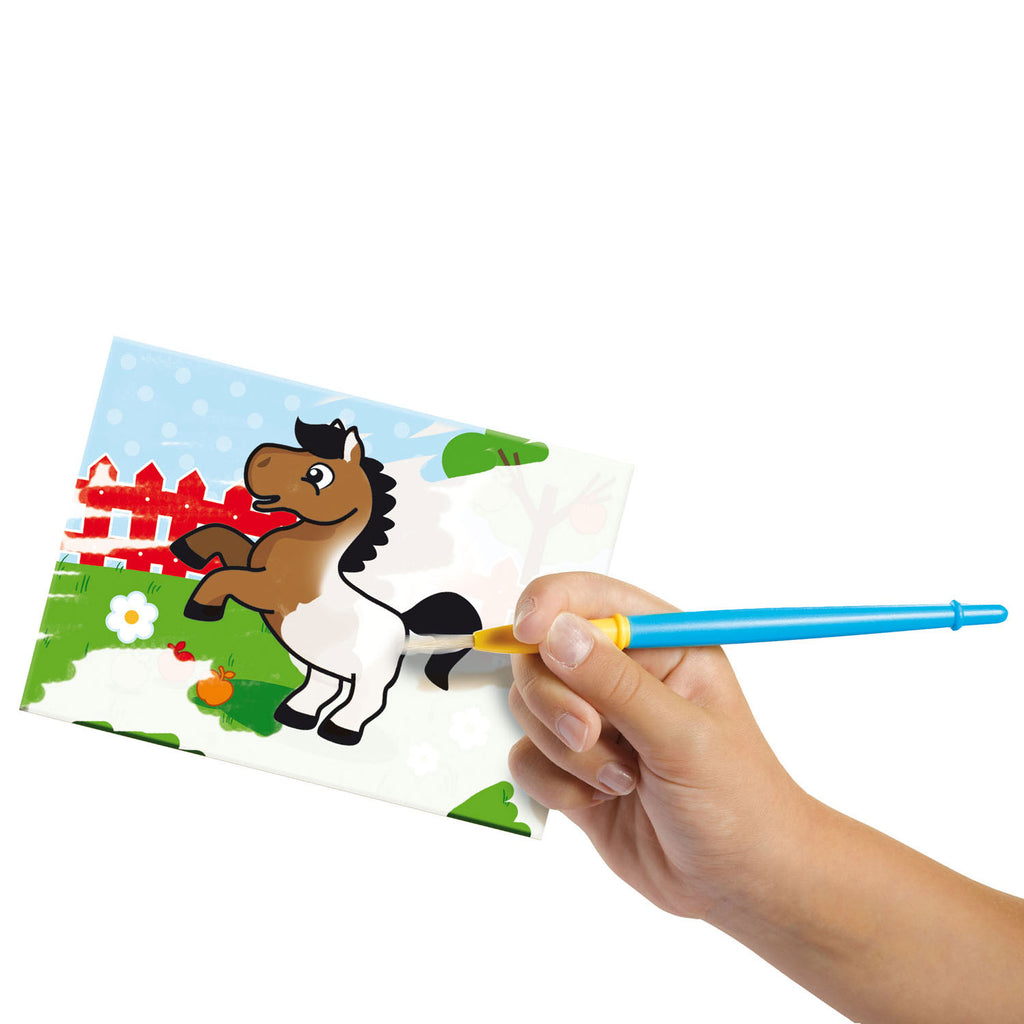 Magie ontmoette water en verven zonder geknoei! Met deze unieke set van SES kunnen kinderen creatief aan de slag. Door met een natte kwast over de voorbedrukte kaarten te gaan, komt de kleurplaat tot leven. De kwast is veilig te gebruiken, omdat de haren niet kunnen uitvallen. Na opdrogen kunnen de kaarten steeds opnieuw worden gebruikt voor eindeloos speelplezier.