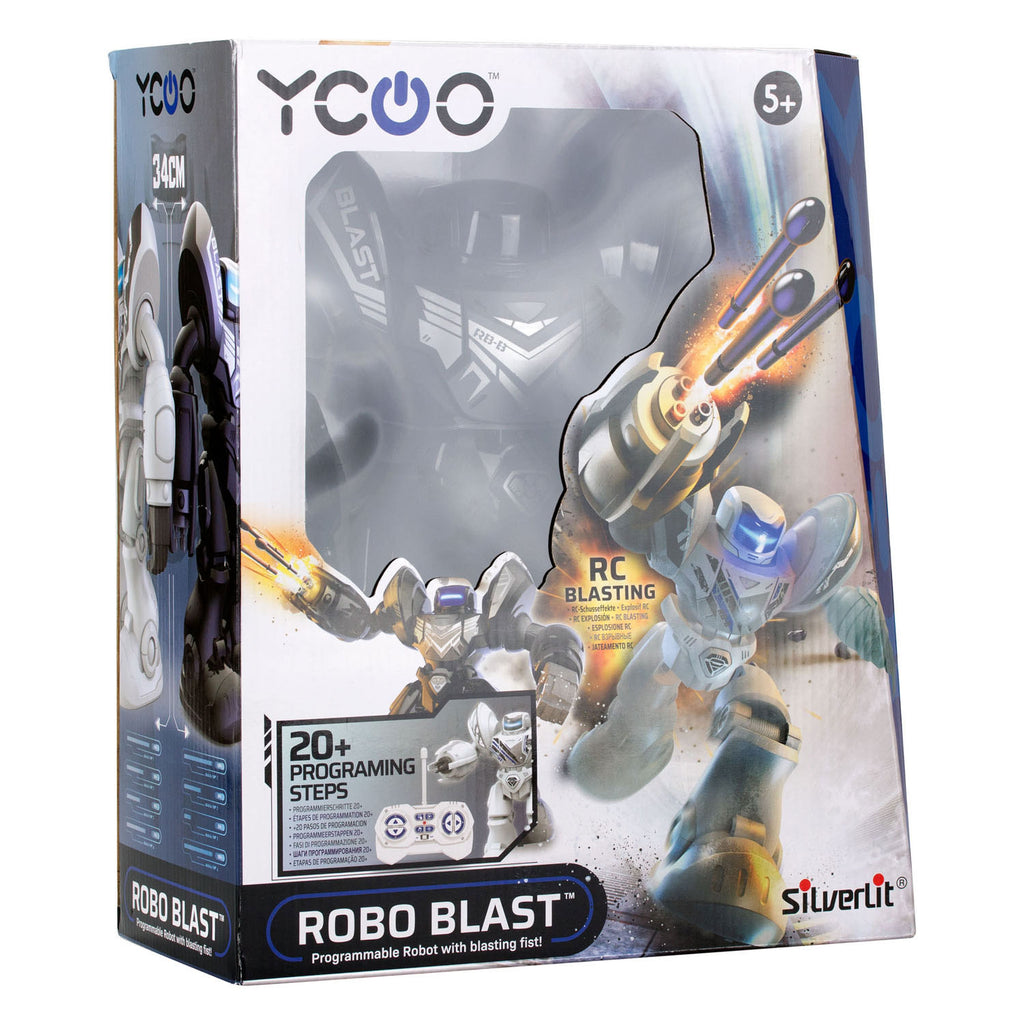 Robo Blast is de programmeerbare robot met een explosieve vuist! Bereid je voor op eindeloos speelplezier en verspreid met deze indrukwekkende zwarte robot van 34cm groot. Hij heeft LED verlichte ogen en is voorzien van robuuste geluidseffecten. Met de controller beweeg je hem alle kanten op en activeer je ook de darts in zijn vuist. Kies tussen een enkel, nauwkeurig schot of een continu schot, waarmee je de drie darts in de stroomversnelling afvuurt. Na al het schieten, schakel je over naar Dansmodus en laat je je verrassing door zijn verschillende dansmoves. Programmeur je Robot tot wel 20 actie's en laat hem in verschillende richtingen lopen en zelfs darts afvuren op commando! Met zijn op afstand bestuurbare schietmogelijkheden, programmeerbare dansmoves en meeslepende geluidseffecten is Robo Blast de ultieme robot voor kinderen. Batterij informatie: Robot: 4 x AA batterijen (niet meegeleverd) - Controller: 3 x AAA batterijen (niet meegeleverd). Leeftijdsindicatie: 5 jaar+.