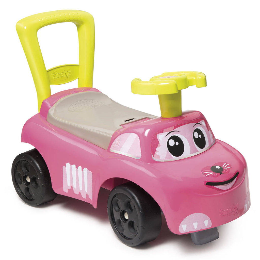 De Roze Smoby Ride On Auto ziet er grappig uit door een vrolijk gezichtje aan de voorkant. Een kindje kan zitten op het ergonomisch zitje of achter de loopauto lopen en zich vasthouden aan de duwstang. Met deze auto leren kinderen gemakkelijk en op een leuke manier lopen. Onder het zitje zit een handig opbergvak. Geschikt vanaf 10 maanden.