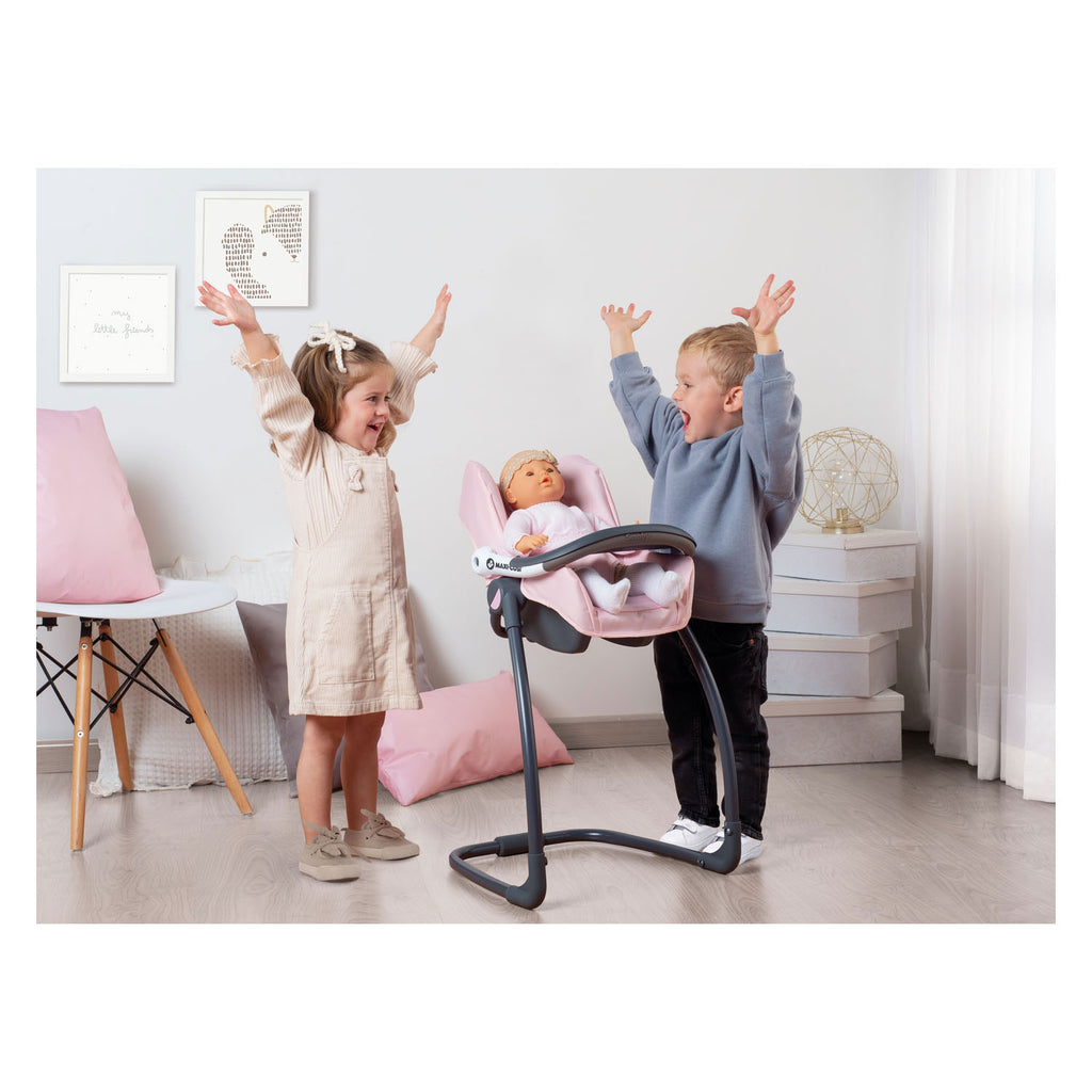 3in1 Maxi-Cosi stoel van Smoby. Deze zachtroze multifunctionele stoel is voor alle poppen tot 42 centimeter (niet inbegrepen). De zitting is gemaakt van stevig kunststof met een stoffen hoes in zachtroze en de poppenstoel heeft een zwart metalen frame. Geschikt voor kinderen van 3 jaar en ouder.