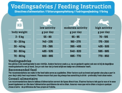 - Analytische ingrediënten: Eiwit 24%, Ruwe Celstof 3,5%, Vetgehalte 13%, Ruwe As 8%, Calcium 2,1%, Fosfor 1,3%, Omega 3 vetstof 0,8%, Omega 6 vet 1,5%
