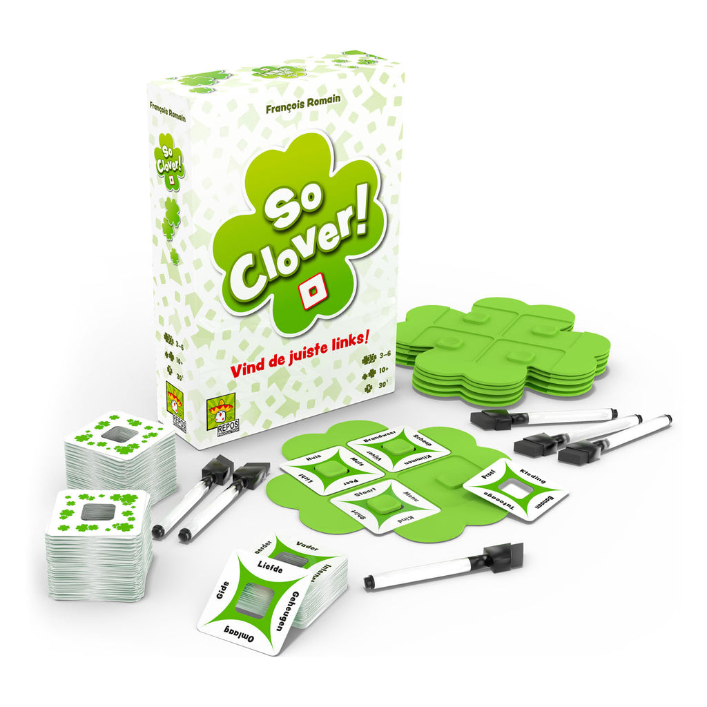 Vind de juiste links bij het coöperatieve woordassociatiespel So Clover! Trek kaarten en noteer op jouw klavervormige spelbord de gemeenschappelijke kenmerken tussen de trefwoorden op jouw kaarten; dit zijn jouw aanwijzingen. Werk vervolgens samen om via een aanwijzingenfase en een beslissingsfase de trefwoorden van elke speler te herkennen. Aan het einde van het spel scoor je punten voor het aantal trefwoorden dat jullie gevonden hebben en noteer je jullie score op de scorelijst. Probeer bij ieder spel jullie hoogste totaalscore te verbeteren! Geschikt voor kinderen vanaf 10 jaar, voor 3 tot 6 spelers, spelduur ca. 30 minuten. Inhoud: 220 kaarten met trefwoorden, 6 klaverblad spelborden, 6 uitwisbare stiften, 1 scorelijst, spelregels.