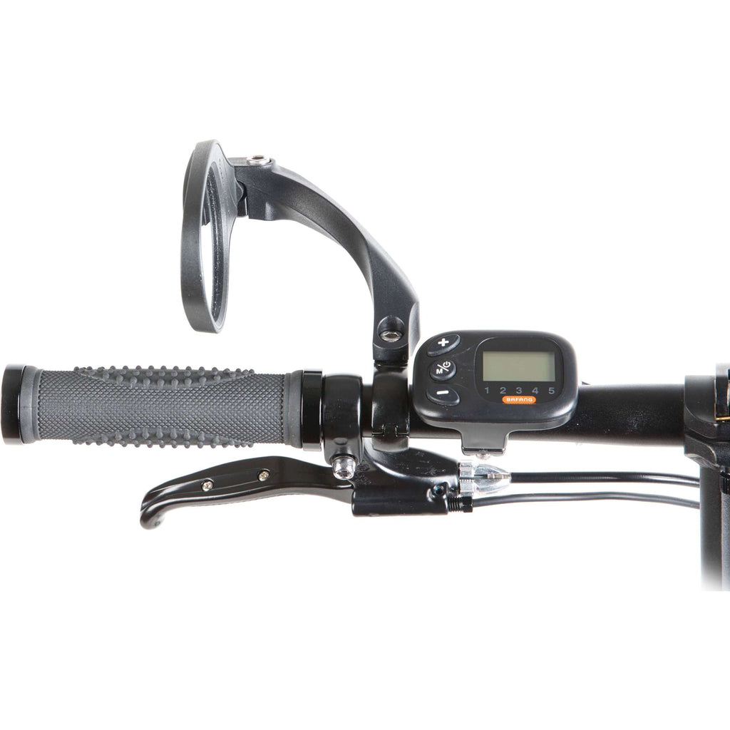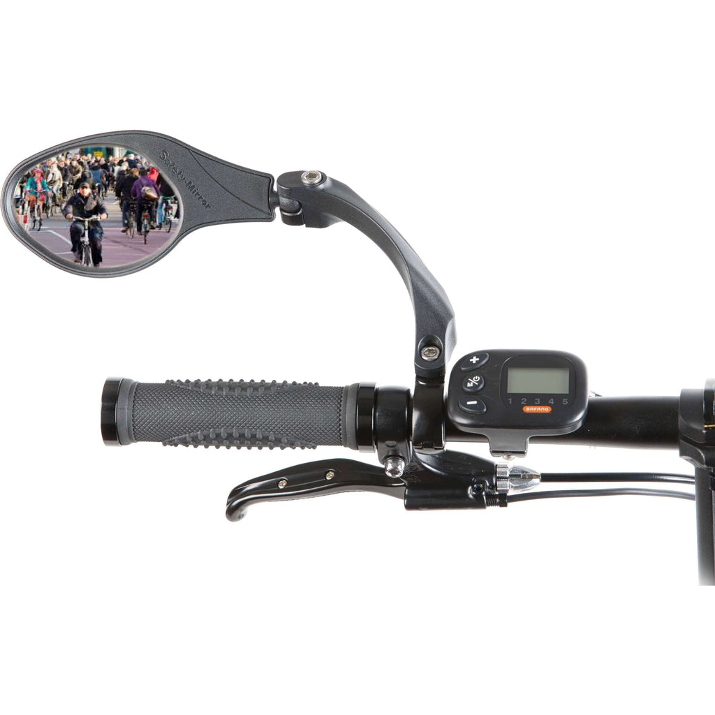 De Mirage spiegel Uno is een veilige en doordachte spiegel voor op de fiets. Deze spiegel is gemaakt van stevig en lichtdimmend glas en heeft een vlak oppervlak waardoor er geen vervorming ontstaat. De spiegel is voorzien van een witte reflector aan de voorzijde, wat de zichtbaarheid in het verkeer vergroot. De Mirage spiegel Uno kan eenvoudig worden bevestigd aan de linkerzijde van het stuur, waarbij een kunststof laag beschadiging van het stuur voorkomt. De lange steun van de spiegel is licht van gewicht omdat deze gemaakt is van aluminium. De kogelbevestiging zorgt voor optimale verstelbaarheid en maakt het mogelijk om de spiegel gemakkelijk te klappen tijdens het vervoer.