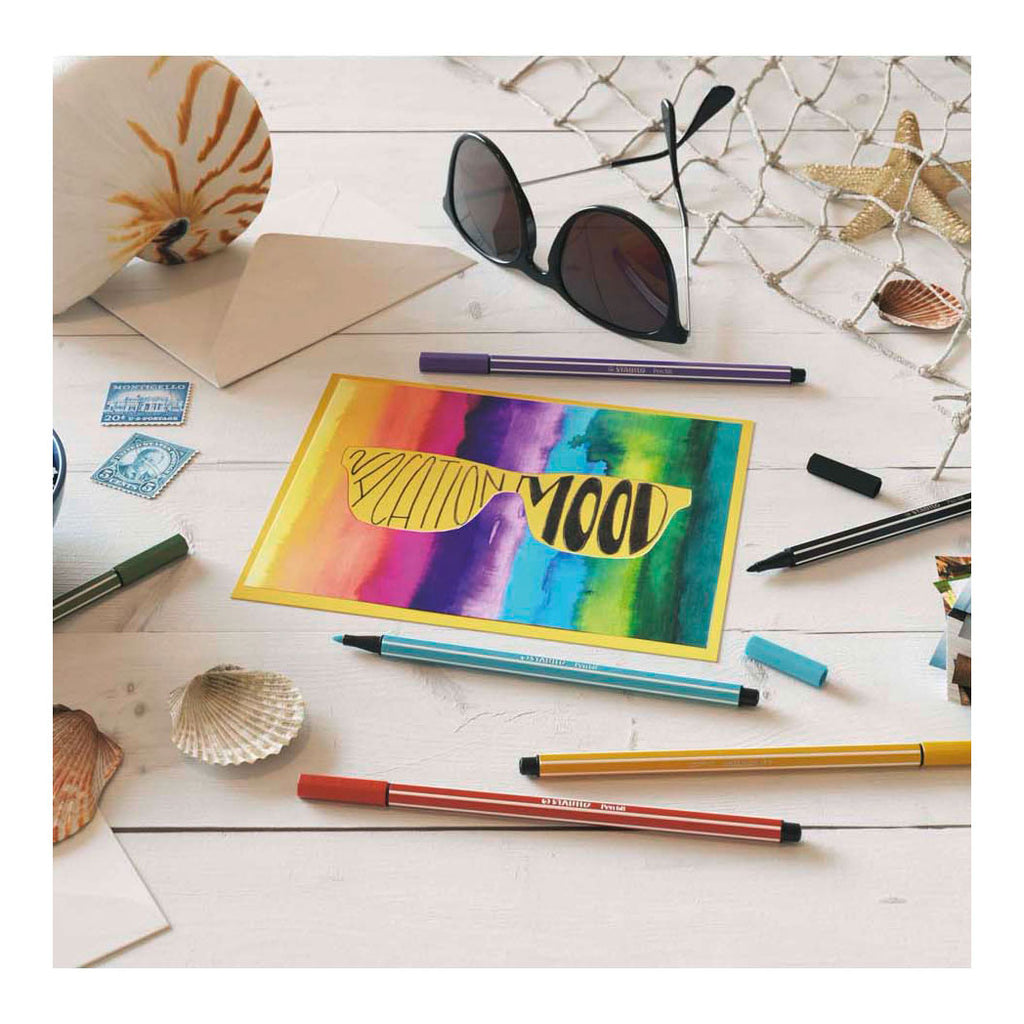 De beste viltstift die je kunt vinden. De STABILO Pen 68 is een viltstift van topkwaliteit, voor het allerbeste resultaat. verkrijgbaar in 65 prachtige, heldere kleuren, inclusief 6 fluorescerende kleuren. Of je nu een professionele kleurt of hobby bent, deze top viltstift is perfect voor jou! · Viltstift van zeer hoge kwaliteit · diverse in talrijke kleuren · Robuuste drukbestendige penpunt · Schrijfbreedte ca. 1 mm · Reukloze inkt op waterbasis · Tast toner en watervaste inkt niet aan · Kan tot 24 uur zonder dop zonder uit te drogen · Hoge glans en kleurintensiteit · Alle kleuren los verkrijgbaar · Mengbaar met water voor mooie aquarel effecten en kleuren blenden De STABILO Pen 68 viltstiften zijn viltstiften van de allerhoogste kwaliteit en bieden oneindig veel kleurmogelijkheden. De punt is 1 mm dik voor krachtige lijnen en de kleuren van vlakken. Het robuuste punt zorgt voor een regelmatige inktafgifte. De viltstift kan 24 uur zonder dop zonder dat de punt uitdroogt. De kleuren zijn intens en zeer goed dekkend. De inkt is op waterbasis en geurloos. Alle kleuren zijn te mengen met water, waardoor er prachtige aquareleffecten en onvermijdelijke kleur verlopen mee kunnen worden gemaakt. Voor het mooiste aquarelresultaat breng je de gewenste kleur aan op een stukje folie of een schoteltje en vervolgens pak je de kleur op met een nat kwastje. Bij gebruik met water is het aan te raden om papier of karton te gebruiken. Alle kleuren kunnen met elkaar gemengd worden, waardoor elke willekeurige kleur kan worden gemaakt. Door regelmatig met een vochtig wattenstaafje over de grote oppervlakken te lastig mooie ontstaan, opvallende kleurovergangen. De kwaliteit van het papier bepaalt ook de kwaliteit van het mengen met water. Niet geschikt voor kinderen onder de 3 jaar, vanwege verstikkingsgevaar door kleine onderdelen.