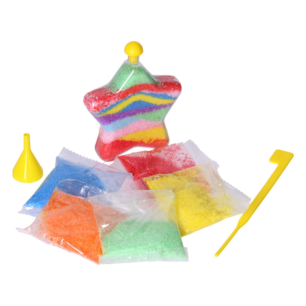 Maak je eigen zandkunst met de vijf verschillende kleuren zand. Het groene zand geeft licht in het donker! Bedenk de mooiste ontwerpen met het zand en maak deze werkelijkheid in het stervormige flesje. Inhoud: flesje met dop, trechter, gereedschap en 5 kleuren zand (geel, oranje, rood, groen en blauw).