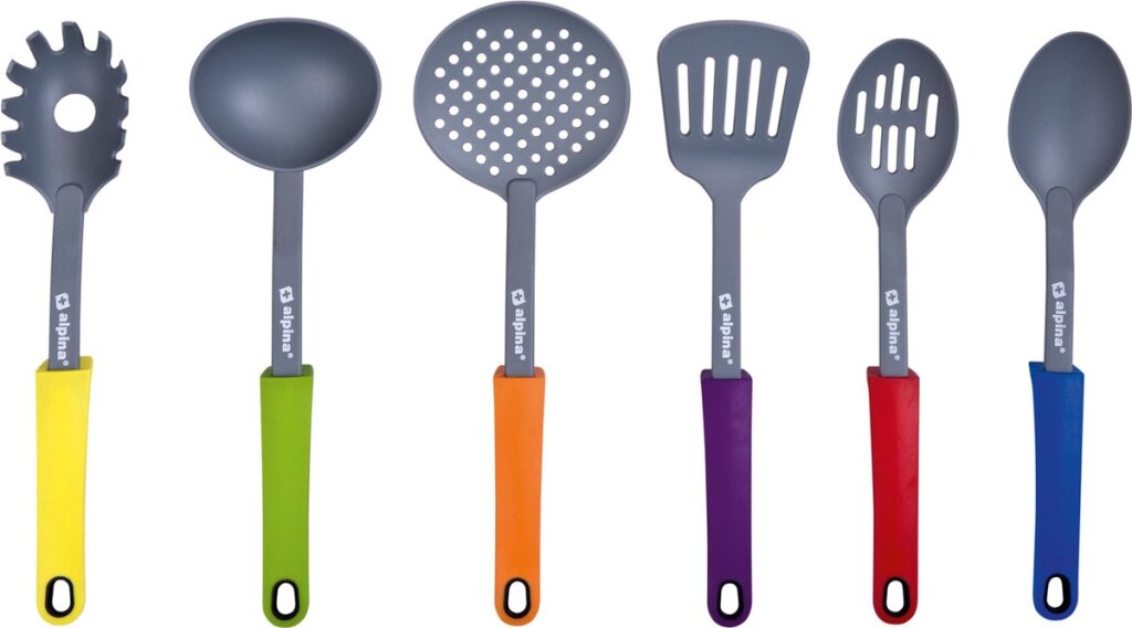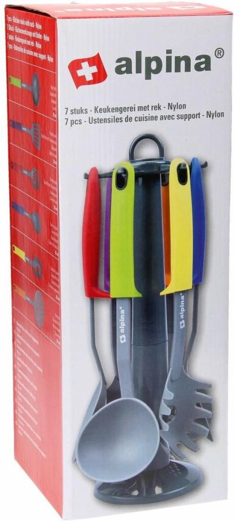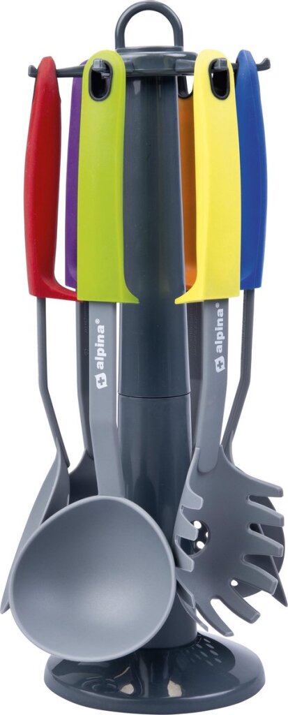 Zoek jij wel eens alle kastjes en laden af naar de juiste spatel of soeplepel? Dat kan veel makkelijker! Met deze vrolijke Alpina-set van 6 hulpstukken op een rek geeft kleur aan je keuken en zorgt dat je altijd de juiste keukenattributen bij de hand hebt. Het vrijstaande rek waaraan ze hangen is circa 40 cm hoog. De keukenattributen hebben handgrepen in vrolijke kleuren: paars, blauw, groen, oranje, rood en geel. Het andere deel is grijs, net als het rek waar ze aan hangen.Voordelen:
