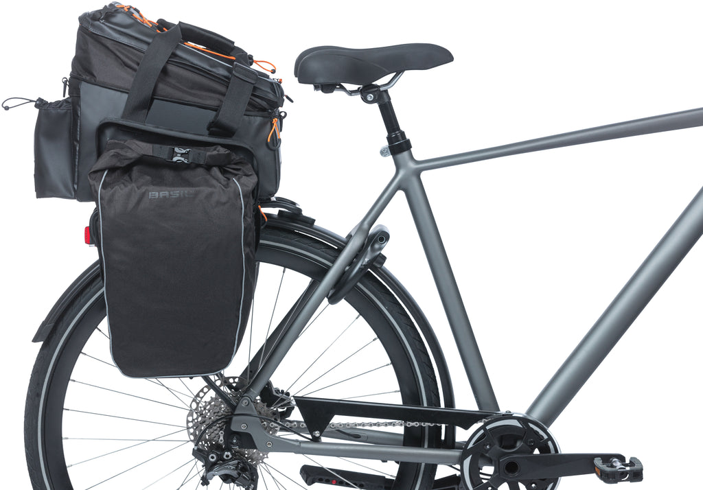 De Basil Miles XL Pro bagagedragertas is de perfecte tas waarbij aan alles is gedacht. Deze sportieve zwarte tas is waterdicht en gemaakt van tarpaulin, waardoor hij duurzaam en betrouwbaar is. Met zijn handige features is deze tas ideaal voor fietsers. De tas heeft twee waterdichte, uitklapbare zijtassen en een uitbreidbaar bovenvak, waardoor de inhoud van 9 liter kan worden uitgebreid naar maar liefst 36 liter. Daarnaast heeft de tas een extra geïsoleerd vak voor een bidon en dividers om het hoofdvak op te delen. Ook zijn er twee vakken waar koelelementen in kunnen worden geplaatst, ideaal voor het koelhouden van eten en drinken. Bovendien heeft de tas een x-vorm elastiek waarmee een casque kan worden vastgezet. De tas kan eenvoudig worden bevestigd dankzij de voorgemonteerde MIK-adapterplaat en kan net zo gemakkelijk weer worden afgeklikt. De tas heeft ook een afneembare schouderband voor extra draaggemak. Product specificaties - Model: Achterdragertas - Dubbel of enkel: Enkel - Afmetingen: 31 x 23 x 22 cm (Buitenwerkse maten) - Volume (Ltr): 36,0 - Geschikt voor: Elektrische fiets, stadfiets, city-trekking fiets - Activiteit: Recreatief, eropuit - Materiaal: Tarpaulin - Kleur: Zwart - Systeem: MIK-systeem - Ook te gebruiken als: Schoudertas - Toepassing: Bagagedrager - Extra vak voor: Thermo bidonvak en vakken voor koelelementen - Sluiting hoofdvak: Roltopsluiting - Laptopvak: Nee - Zijvak(ken): Ja - Voorvak(ken): Nee - Diefstalbeveiliging: Nee - Waterbestendig: Waterdicht - Snelbinders mogelijk: Nee - Afneembaar: Ja - Handvat: Ja - Draagcapaciteit: Max. 5 kg - Garantie: 2 jaar, via het verkooppunt waar je het product hebt gekocht - Binnenvak: Ja