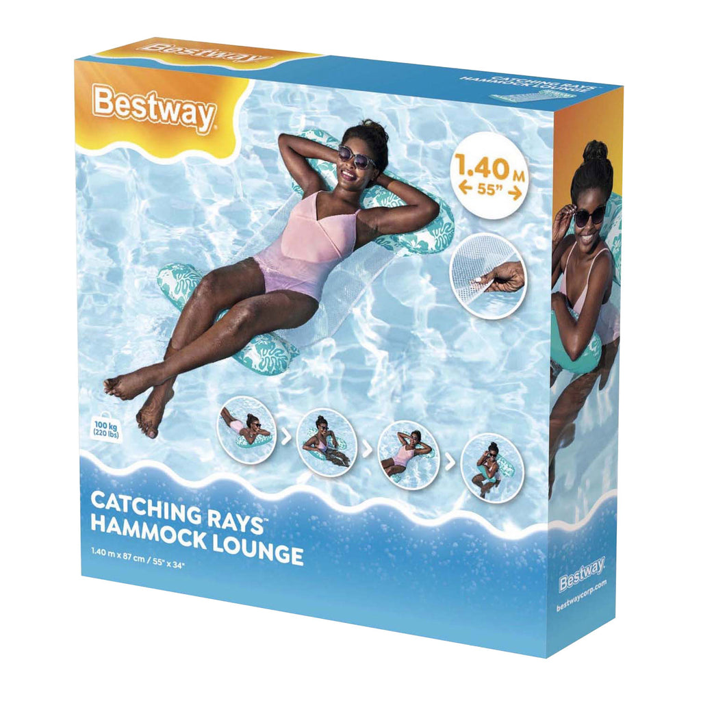 Leun achterover, ontspan en laad weer op terwijl u geniet van de warme zomer op de Bestway Catching Rays Hangmat Zwembadlounger. U zult zich zelfzeker voelen in de zon dankzij de Color Shield beschermlaag, die de kleuren helder houdt en voorkomt dat de kleur op uw huid terechtkomt wanneer het nat wordt. Met het tropische bloemontwerp en de CoolDown zitplaats van gaas die u net onder het wateroppervlak houdt, zal u op zonnige dagen heerlijk koel blijven. Het gaas materiaal heeft ook een duurzame coating om lekkages en schade te voorkomen. Met de innovatieve 4-in-1 omvormbare structuur kunt u uw comfort aanpassen zodat u kunt ontspannen hoe u ook wilt: een platte lounger, ligstoel, hangmat of zadelzitje. En met een ultra-ondersteunende steun voor hoofd en benen, zult u de hele dag kunnen ontspannen in stijl en comfort! Met het eenvoudig opblazen en leeglopen, vouwt deze hangmat lounger mooi op om het op te bergen tijdens het laagseizoen. Deze luxueuze Bestway Catching Rays Hangmat Lounger is de ultieme manier om tot rust te komen op het water.