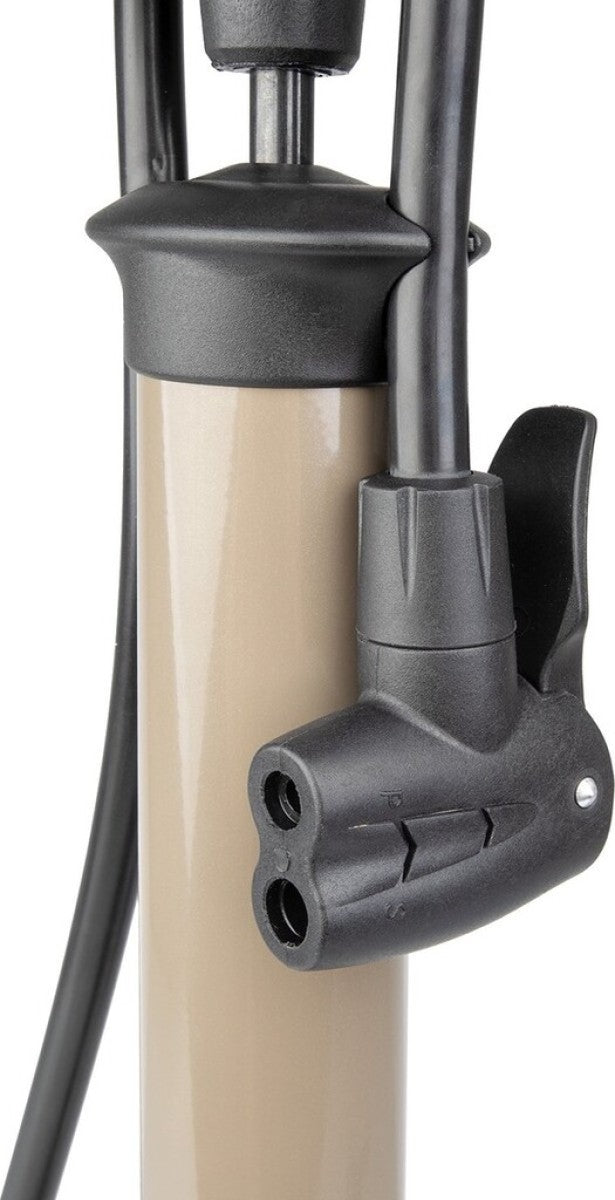 De Beto hogedrukpomp is een krachtige fietspomp met een bereik van 11 bar / 160 PSI. Deze pomp is ideaal voor E-bikes, racefietsen, ATB's en speed pedelecs. Met de geïntegreerde manometer, die laag geplaatst is, kunt u eenvoudig de bandenspanning aflezen. De stalen pompbuis zorgt ervoor dat deze fietspomp zeer stevig is. Daarnaast is de pompslang voorzien van een dubbele kop, waardoor u alle soorten fietsventielen zonder hulp van verloopstukken kunt oppompen. Deze fietspomp is geschikt voor Schrader, Dunlop, Presta, Frans, en ATB ventielen. Product Specifications: - Merk: Beto - Basismateriaal: Kunststof, Staal - Basiskleur: Bruin, Zwart - Geschikt voor Tubeless: Ja - Soort ventiel: Dunlop / Hollands / Presta / Frans / Schrader / ATB - Maximale luchtdruk: 160 PSI - Drukmeter: Ja - Lengte slang: 600 mm - Hoogte eenheid: 170 mm - Geschikt voor: Schrader, Dunlop & Presta ventielen - Laag geplaatste drukmeter tot 11 bar/160 PSI - Uitgerust met universeel pompventiel en extra ventiel adapter - Ideaal voor het oppompen van fietsbanden, maar ook te gebruiken voor ballen, luchtbedden, etc.