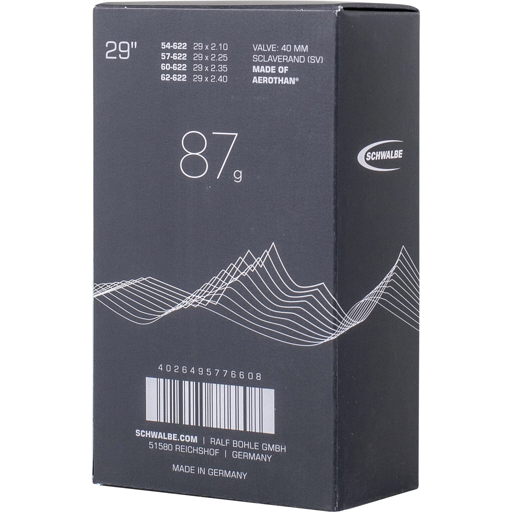 Schwalbe bnb SV19E Aerothan 28 x 2.10 - 2.40 fv 40mm. Extreem licht tot en met het ventiel. De binnenband zijn +/- 40% lichter dan een vergelijkbare Schwalbe Extralight binnenband. Het nieuwe materiaal voorkomt plotesling luchtverlies. De binnenband heeft een minimale rolweerstand, wat zorgt voor een maximaal rijdynamiek. Dankzij de extreme hittebestendigheid is de binnenband goedgekeurd voor velgremen. Zelfs bij een lage bandenspanning levert de binnenband stabiele rijeigenschappen. De montage is eenvoudig zonder verschuiven of bekneld te raken. De binnenband is 100% reycyclebaar.