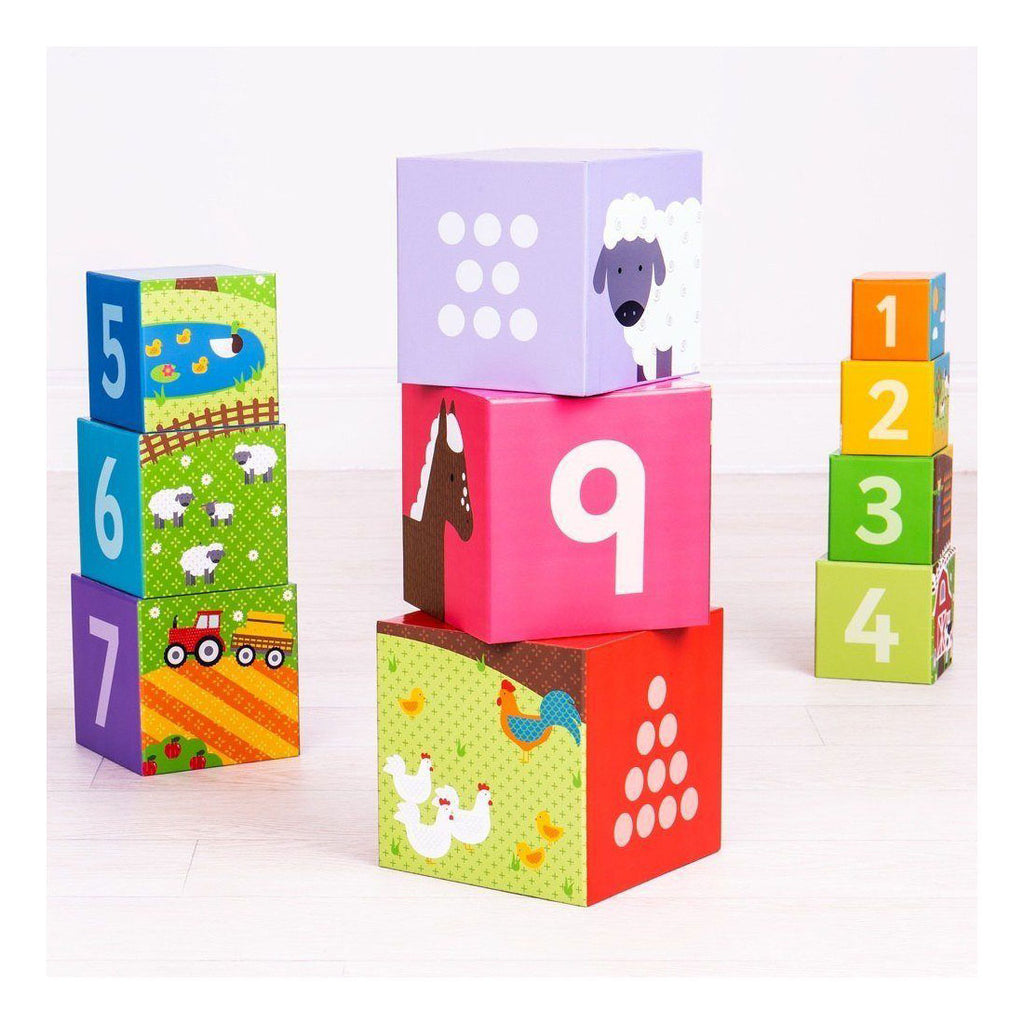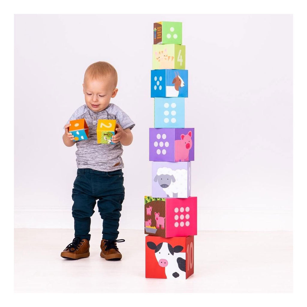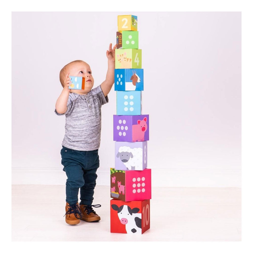 Deze prachtige stapelkubussen zijn perfect voor vroeg leren en stimuleren vroege rekenvaardigheid, geletterdheid, kleur- en vormherkenning. De kubussen moeten in de juiste volgorde worden gestapeld, van groot naar klein, om een toren te creëren. Elk blok heeft een gedetailleerde boerderijscène, een nummer en stippen die overeenkomen met het nummer op het blok. Terwijl de kleintjes elke kubus stapelen, kunnen ze de scène op het boerenerf aan één kant bespreken, hun taalvaardigheid en woordenschat ontwikkelen, en tellen hoeveel stippen er zijn en ervoor zorgen dat ze eindigen met hetzelfde nummer als op de kubus, en vroege telvaardigheden ontwikkelen en nummerherkenning.