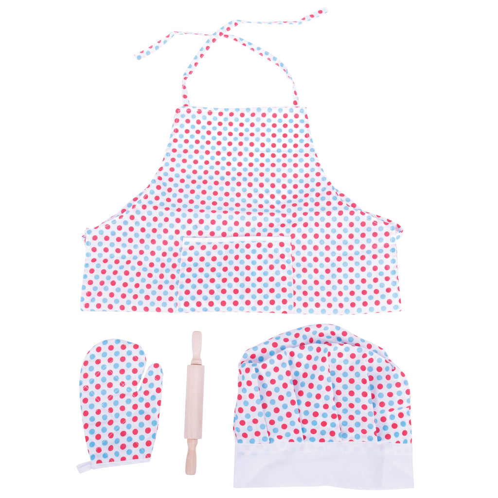 Word een echte chef met deze gestipte keukenset van BigJigs. De set bevat een koksmuts, een schort en een ovenwant van vrolijk gestipte stof. Verder vind je in de set 4 koekvormpjes en een deegroller, om de lekkerste koekjes mee te maken!