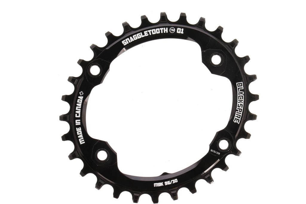 Een narrow/wide ovaal Snaggletooth kettingblad van Blackspire. Dit kettingblad is gemaakt van duurzaam 7075 T-6 aluminium en is CNC gefreesd voor een lange levensduur. Het is gesneden uit 0,313" dikke aluminium plaat om lichtgewicht en sterkte te garanderen. Het kettingblad heeft een ovaliteit van 12-13% met een timing van 115° na TDC (Top Dead Center). De bevestiging gebeurt met schroefdraad in het blad en maakt gebruik van standaard M7-schroeven voor uw gemak. De ingebouwde nokken corrigeren de kettinglijn tot 49 mm. Dit kettingblad is geschikt voor gebruik in groepen met 9, 10, 11 of 12 versnellingen.