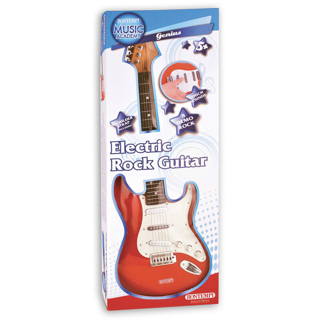 Word een echte rockster met deze elektrische rode gitaar. De elektrische gitaar telt 6 metalen snaren die je met de knoppen bovenop afstemt. De gitaar bevat 8 demo rock liedjes en wordt geleverd met een gitaarband. Wat een gaaf optreden! De set is gemaakt van stevig kunststof. Werkt op 3 AA batterijen (niet inbegrepen).