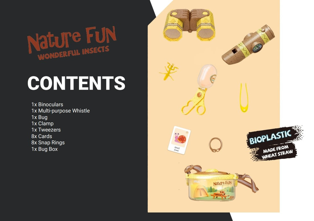 De Kids Insect Explorer Set – 22-delig bevat alles wat jonge avonturiers nodig hebben om direct op ontdekking te gaan: 1x verrekijker, 1x multifunctionele fluit, 1x insect, 1x klem, 1x pincet, 8x kaarten, 8x snap rings en 1x insectenbox. Alles netjes verpakt en klaar voor het volgende ontdekavontuur.