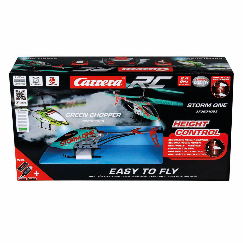 Ga de lucht in met Carrera RC Storm. Stijg op en veel plezier! De Carrera RC Storm One-helikopter is klaar om door de lucht te zwerven en elk detail te verkennen met supernauwkeurige digitale proportionele bedieningselementen. De opvallende turquoise helikopter heeft oranje accenten en heeft een rotordiameter van 19,5 cm. Trekt de aandacht op vluchten met piloten van 8 jaar en ouder in woonkamers en kinderkamers over de hele wereld. Automatisch opstijgen en landen en automatische hoogteregelingsfuncties maken opstijgen leuk en vliegen gemakkelijk, zelfs voor beginners! Storm One blijft tot 6 minuten in de lucht voordat de ingebouwde 3,7-V - 150mAh Li-Po batterij ongeveer 30 minuten moet worden opgeladen. Storm One is een 'Ready to Fly'-model, dus de actie begint direct uit de doos.