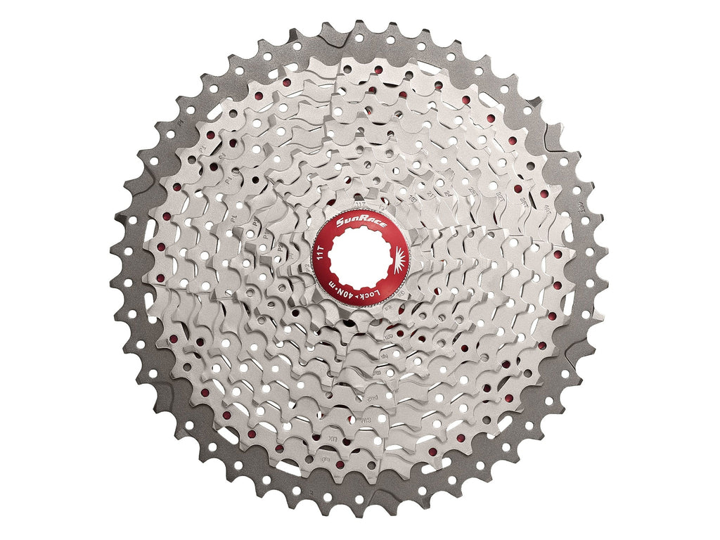 De SunRace cassette is een 11-speed cassette geschikt voor gebruik met Shimano/Sram body. Deze cassette is ontworpen voor mountainbikes en biedt een breed scala aan versnellingen. Met een vertanding van 11-46T kunt u gemakkelijk schakelen tussen verschillende terreinen en snelheden. De cassette is gemaakt van hoogwaardig staal en aluminium, wat zorgt voor duurzaamheid en betrouwbaarheid tijdens uw ritten. Met een gewicht van 465 gram is deze cassette lichtgewicht en draagt het niet veel bij aan het totale gewicht van uw fiets. Upgrade uw mountainbike met de SunRace cassette voor soepele en efficiënte schakelprestaties. Specificaties: - Aantal versnellingen: 11 - Cassette- & Pionverhouding: 11-46T - Kleur: zilver - Materiaal: staal - Diepte: 41 mm - Gewicht: 500 gram - Type: CSMX8MX 11-Speed Wide-Ratio Cassette - Alu 7075 Grootste tandwiel - Alu Spiders, Lockring & Spacers - 11-46T [EAZ] [Finish - O [Black Chrome] / X [Metallic Silver] - Gewicht - 465g [AZ] - Artikelnummer: CSMX8 EAZ-BOX M - EAN: 4710944252453 - Merken: SunRace - Model: CSMX8 - Type: MTB - Fietstype: Mountainbike - Netto gewicht (g): 465 - Aantal tandwielen: 11 - Compatibele body: Shimano - Tandwielverhouding: 11-46 - Kleur: Zilver Productspecificaties: - Aantal versnellingen: 11 - Vertanding: 11-42 (11-13-15-17-19--21-24-28-32-36-42) - Kleur: metallic - Materiaal tandkrans 1-10: Hi-Tensile Steel - Materiaal tandkrans 11: A7075 Aluminum / Anodized - Gewicht: 401 gram