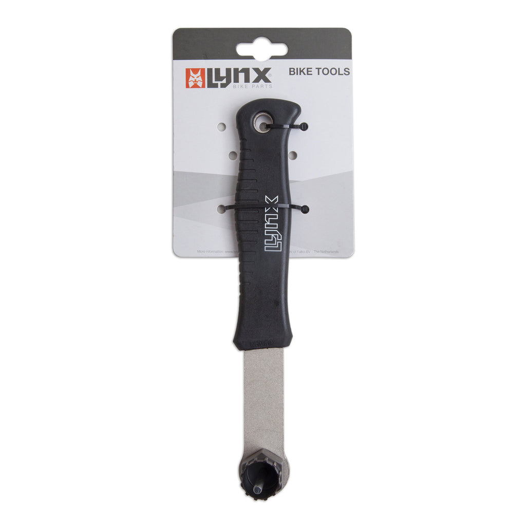 De Lynx cassette afnemer is een handig gereedschap waarmee je eenvoudig Shimano of Sram cassettes kunt monteren en demonteren. De sleutel is uitgerust met een lange pin, zodat deze niet wegschiet bij het losdraaien van de sluitring, zelfs niet bij het uitoefenen van veel kracht.