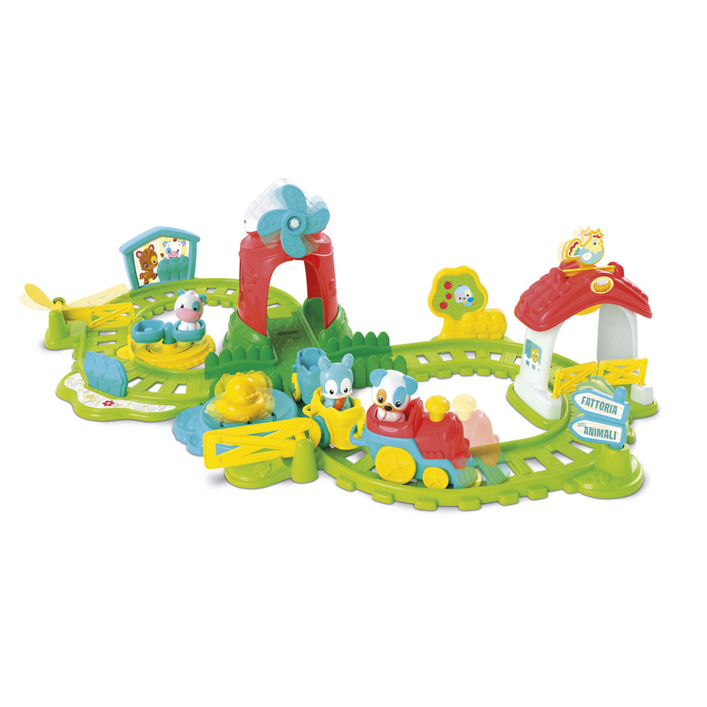 De trein snelt mee terwijl hij door een leuk parcours rijdt, dat ook een speelset is, ondergedompeld in een typische boerderijomgeving. Door de schoorsteen aan te raken, gaat de trein op een fantasierijke reis met zijn vrienden: een hond, een koe, een konijn en een eendje. Wanneer de trein voorbij rijdt, komt de boerderij tot leven: de gieken heffen op, de molen begint te draaien en de haan en het eendje geven hun onderscheidende geluiden. Voor echt speelplezier zorgt het sluiten van de gele poort ervoor dat het eendje in de vijver 'zwemt' en de draaimolen draait. Stimuleert handmatige vaardigheden, hand-oog coördinatie en verbeelding.