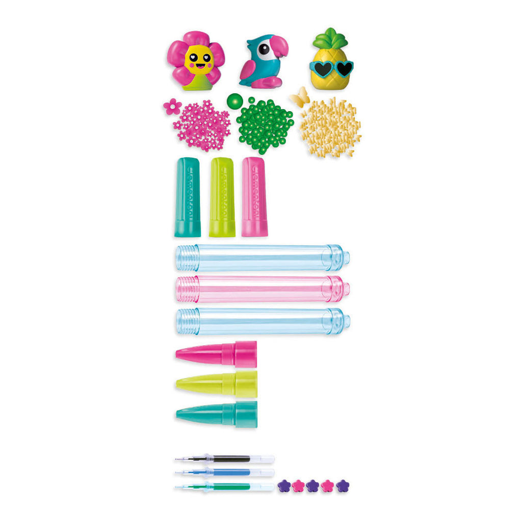 Een originele creatieve kit waarmee je 3 pennen kunt creëren en personaliseren met verschillende decoraties in een tropische stijl Een praktische en rijke kit bestaande uit: 3 pennen, 4 verschillende kleuren inkt, 3 personages en alle instrumenten die nodig zijn om ze te vervaardigen. Een nieuw Idea spel waarmee je je eigen pennen kunt creëren en personaliseren, met vele accessoires en decoraties. Een spel waarmee je niet alleen je eigen pen kunt personaliseren. Je kunt hem helemaal zelf creëren en je fantasie de vrije loop laten Ontwikkeld en ontworpen in Italië. Aanbevolen vanaf 6 jaar.