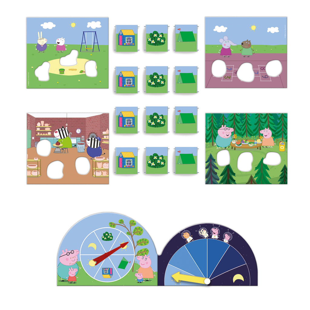 • Een samenwerkingsspel waarbij kinderen voor het donker wordt gezamenlijk moeten ontdekken waar Peppa en haar vriendjes zich verstopt hebben! • Kinderen spelen verstoppertje met Peppa en haar vriendjes, vinden hun schuilplaatsen en brengen ze terug naar mama en papa voordat het donker wordt. • Het spel bevat 4 kaarten, elk met 3 personages om in de vormen te passen, 12 kartonnen doosjes om te gebruiken als verstopplekjes, een dobbelsteen en een timer. • Haal de 12 personages uit de kartonnen kaarten en verstop ze op diverse plekjes. Kinderen gooien omstebeurt met de dobbelsteen, openen aan de hand van de uitkomst de doosjes en pakken het personage. • Het doel van het spel is alle personages in de bijbehorende kaart leggen voordat de timer eindigt op de maan (begin van de nacht).